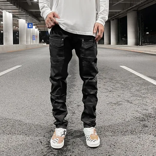 Streetwear Kanye Slim Fit Feet Coated Black Jeans Pants for Men Pocket Brushed Wax Tapered Pants Man Casual Cargo Jeans Y2k