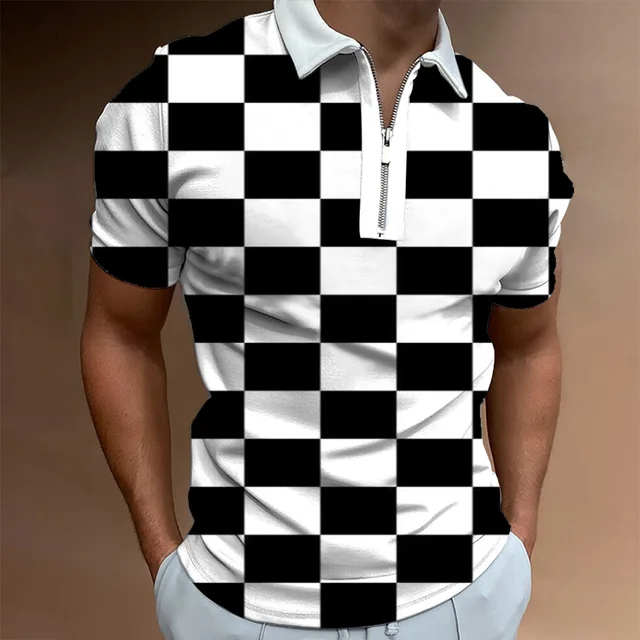 Black And White Checker 3D Prining Men’s Polo Shirt Business Casual Lapel Vintage Short Sleeve Zipper Golf Tops Fashion Designe