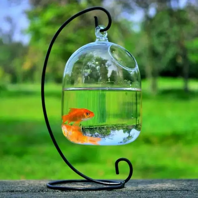 Round/Rectangle Shape Hanging Glass Aquarium Fish Tank Fish Bowl Transparent Vase Ornament With Rack Holder Home Decoration