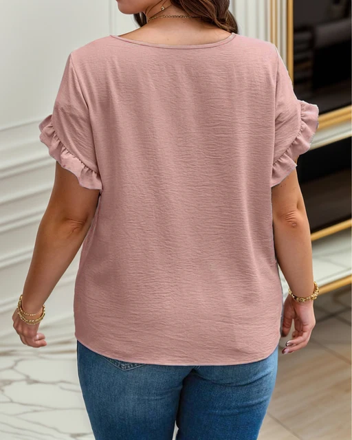 Plus Size 1XL-5XL Women’s Solid Color Short Sleeve BlouseV Neck Bell Sleeve Blouse Casual Pullovers Shirt Top