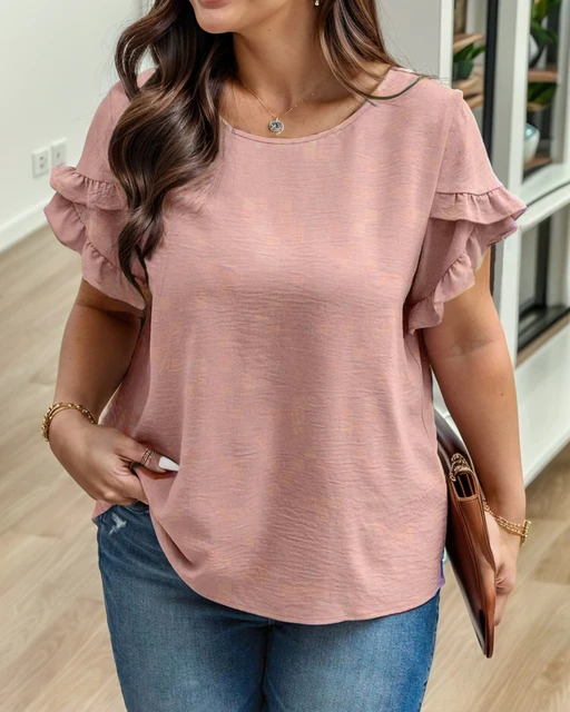Plus Size All Over Print Crew Neck Blouse, Casual Ruffle Sleeve Blouse For Spring & Summer, Women’s Plus Size Clothing