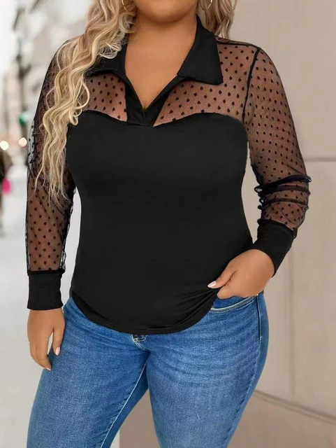 Women’s Plus Size 1XL-5XL Swiss Dot Sleeve Shirt Ladies Casual V Neck Solid Shirt For Spring & Fall Women’s Clothing Fashion
