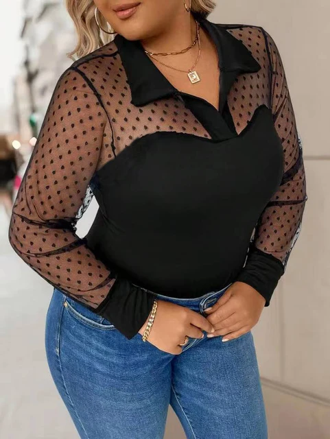 Plus size women’s fashionable solid color hollowed out mesh patchwork long sleeved shirt
