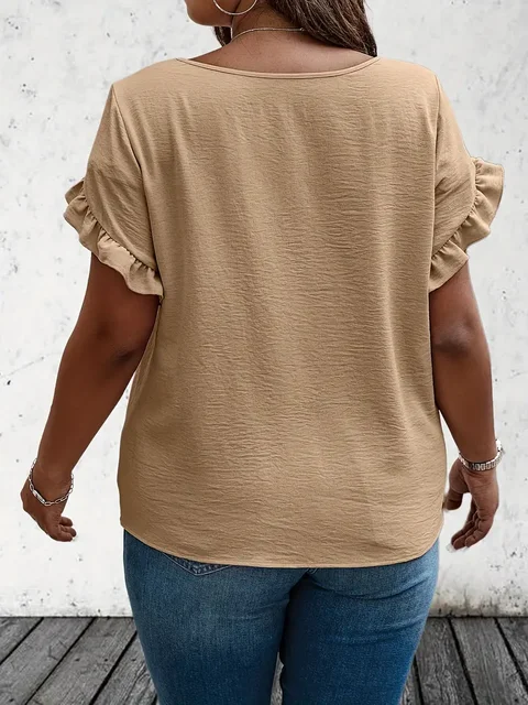 Women 1XL-5XL Plus Size Ruffle Trim T-Shirt Ladies Solid Colors Flattering Casual Top Spring Summer Women Short Sleeve Clothing