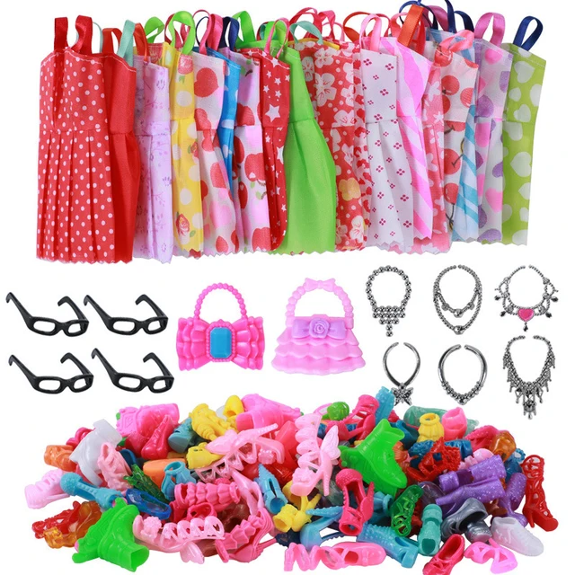 Fashion Handmade 32 Items Accessories=Random 10 Items Dress+Random 10 Pairs of Shoes+6 Necklace+4 Glasses+2 Bags for Barbie Doll