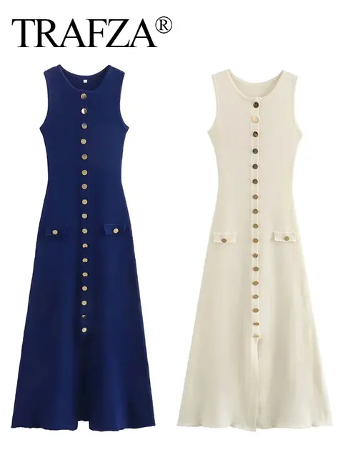 TRAFZA Women Elegant Solid Knitted Dress Single Breasted O Neck Sleeveless Dresses With Pockets Slim Midi Dress Office Lady TRAF