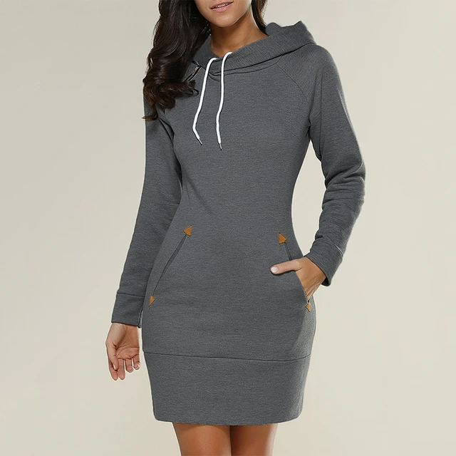 Women‘s Knee-Length Pockets Dress Hooded Warm Sweat Shirt Long Sleeve Side Zip Neckline Simple Casual Sports Skirt