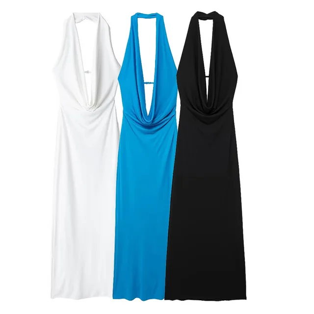 Willshela Women Fashion Solid Pleated Backless Lace Up Midi Dress Vintage Halter V-Neck Female Chic Lady Dresses
