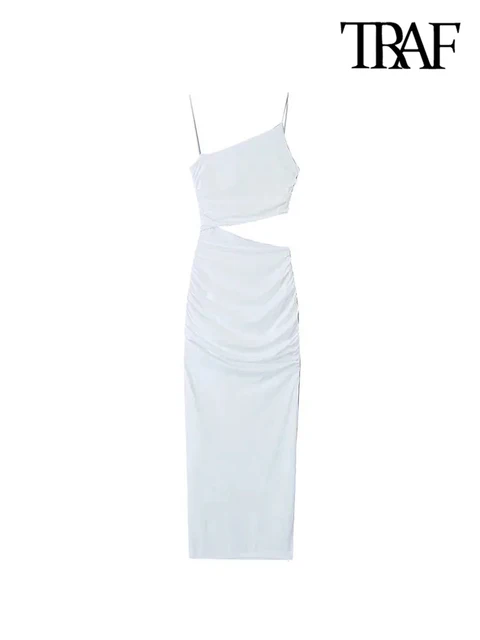 TRAF Women Fashion With Gathered Hollow Out Midi Dress Sexy Asymmetric Neck Thin Straps Female Dresses Vestidos Mujer