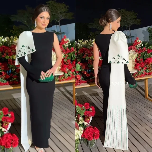 Customized Simple Black O-neck One-Shoulder Evening Dress Contrast Color Train Crystal Party Gown Floor Length Full Sleeves Gown
