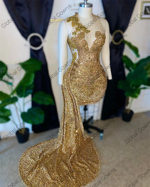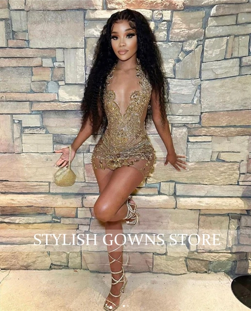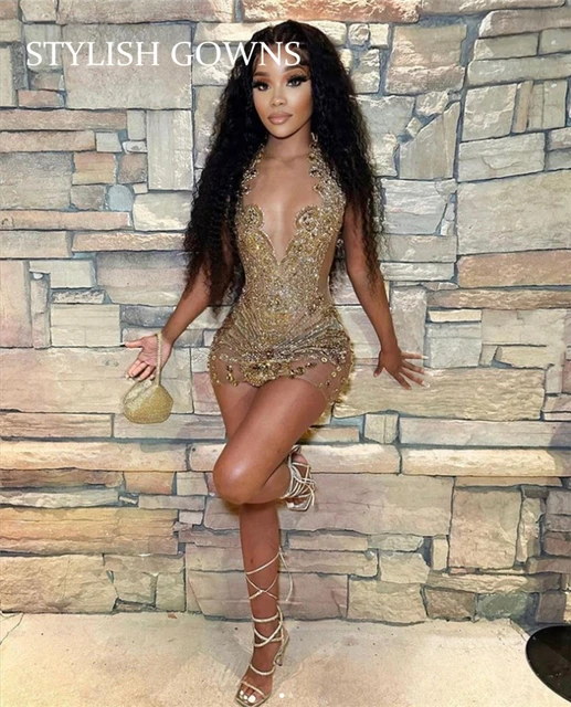 Sparkly Gold Sheer O Neck Short Prom Dress For Black Girl Beaded Crystal Diamond Birthday Party Dresses Mini Cocktail Customized