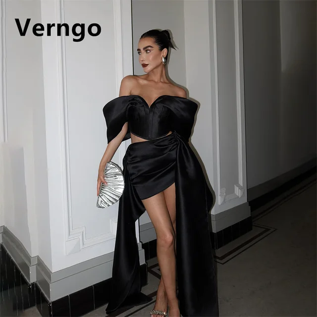 Verngo Black Satin Evening Dress Women Off The Shoulder Short Prom Dresses Draped Train Cocktail Party Dress 2024 customized