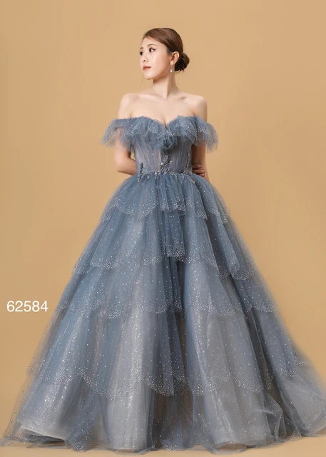 Women Long Blue Tulle Off Shoulder A-Line Empire Prom Sparkly Sequins Evening Dresses Party Graduation Formal Ball Gown