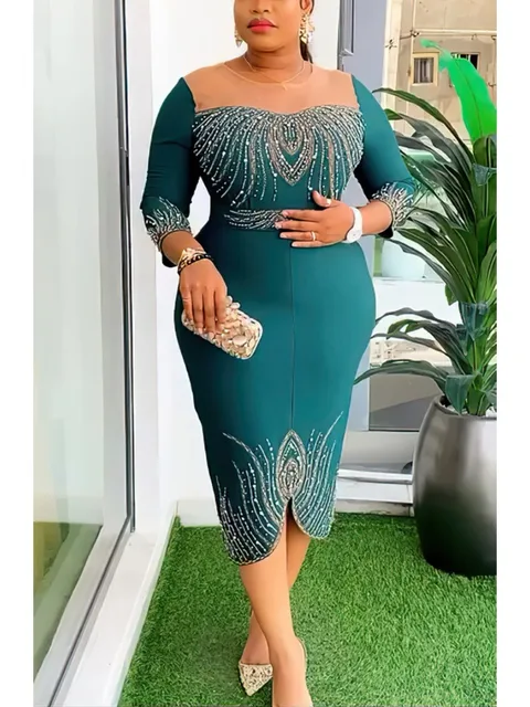 Luxury Hot Drills Evening Party Dress O Neck Mesh Patchwork Slim Fit Knee Length Formal Occasion Event Church Gowns 2024 New In