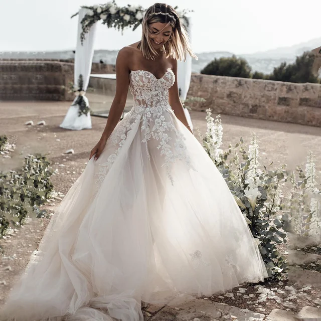 Customized Breathtaking Strapless Wedding Dress Featuring Stunning Crystals Lace Appliques and Flowy Silhouette Bridal Dress