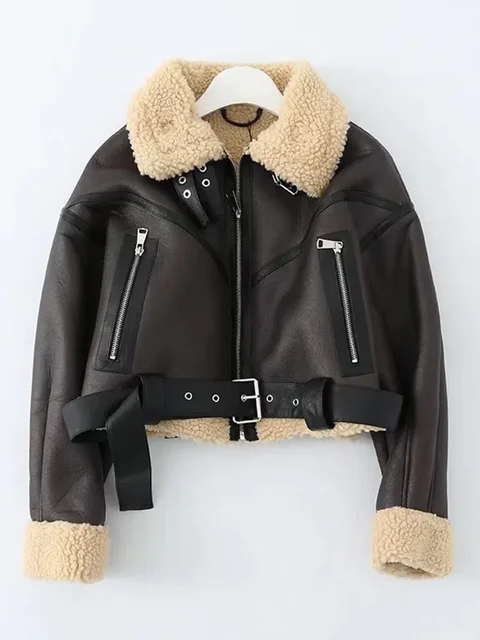 Ailegogo Winter Women Streetwear Faux Lamb Leather Fur Short Jacket with Belt Moto Biker Thick Warm Sheepskin Coat Outwear