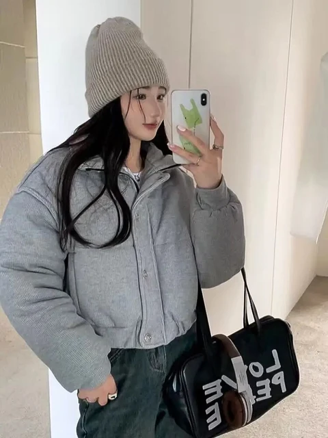 Korean Style High-end Short Gray Cotton Parkas Loose Warm Thickened Stand Collar Outwear 2023 New Winter Coat Women
