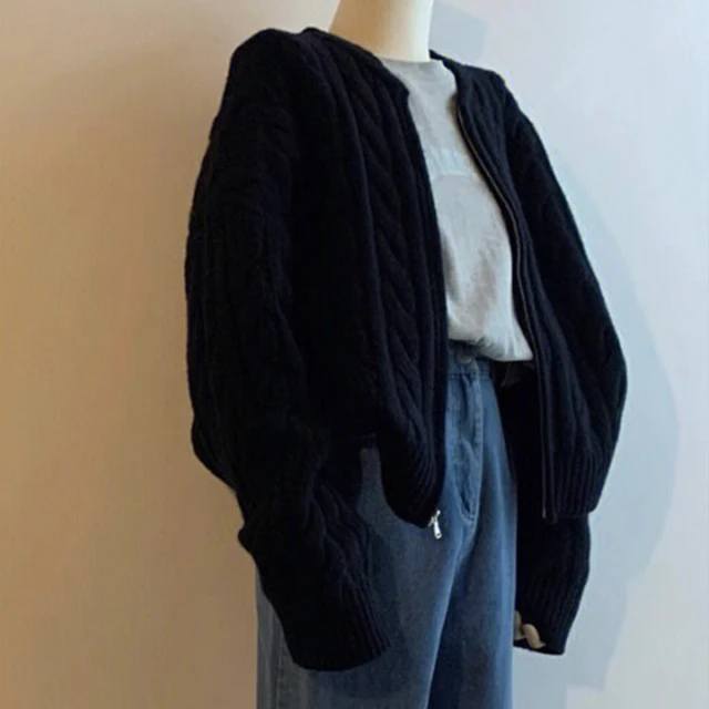 New Style Solid Color Zipper Knitted Cardigan Women Autumn Winter Casual Twist Long Sleeve Sweater Jacket