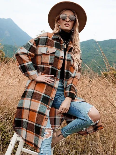 Plus Size Elegant Autumn/winter Woolen Trench Coat Side Slit Lapel Loose-fit Plaid Jacket