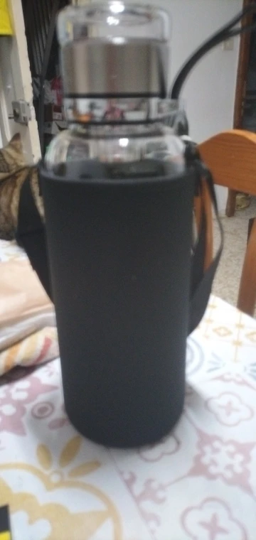 Nice size glass water bottle with tea strainer and glass lid. It’s got a bottle carry pouch and another carry handle on the lid, my only gripe is the strong plastic smell but this will fade with multiple washes i think.