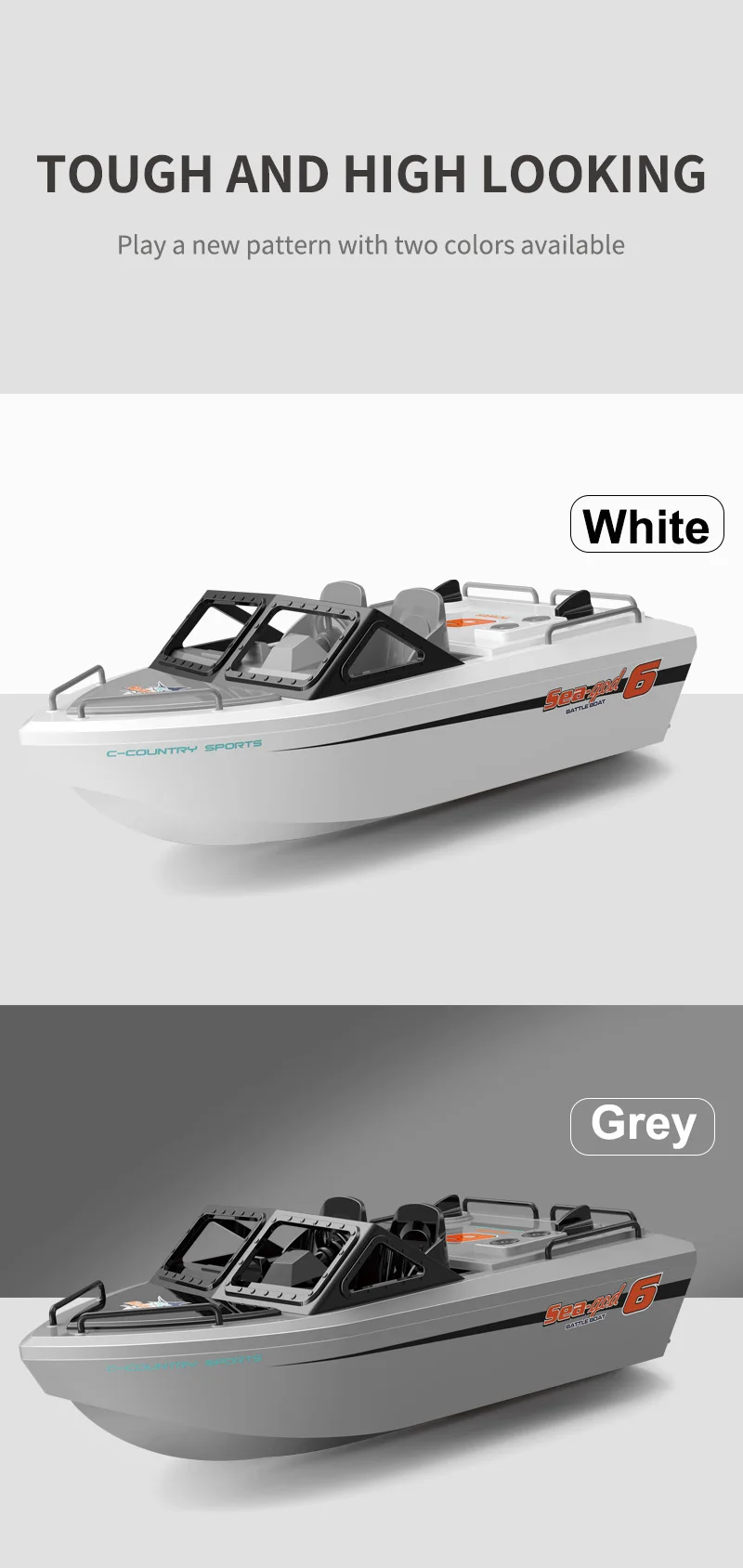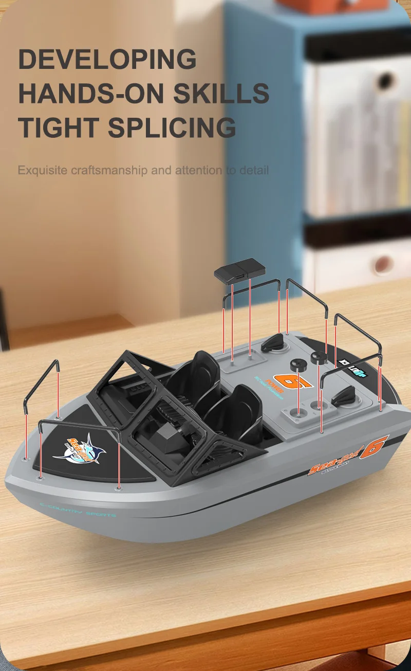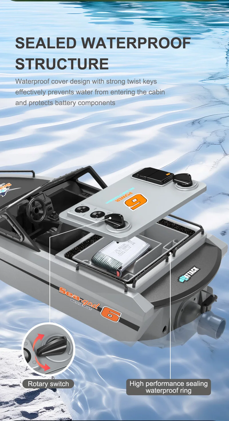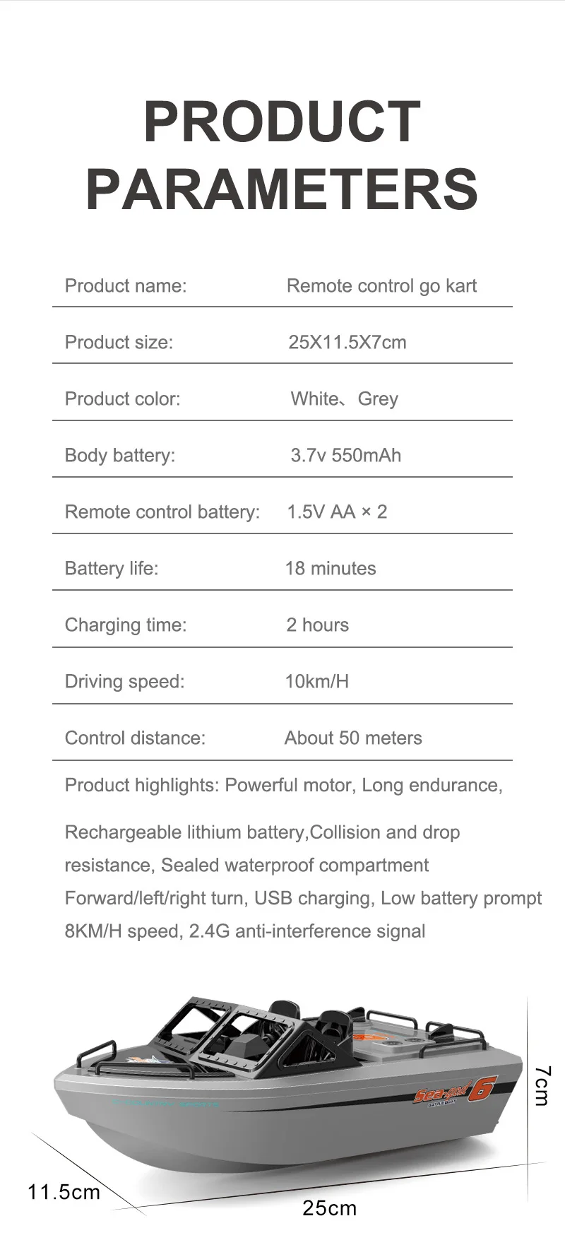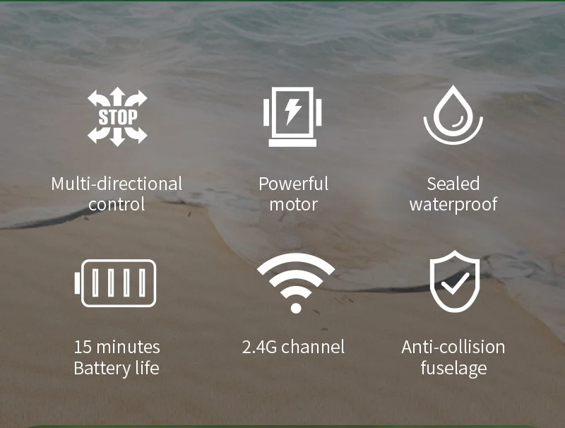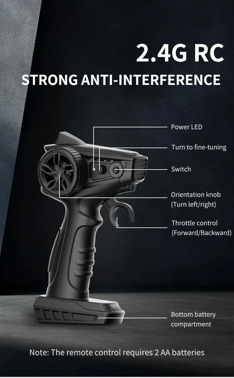Rechargeable lithium battery,Collision and dropresistance, Sealed waterproof compartmentForward/left/right turn, USB charging, Low battery prompt8KM/H speed, 2.4G anti-interference signal
