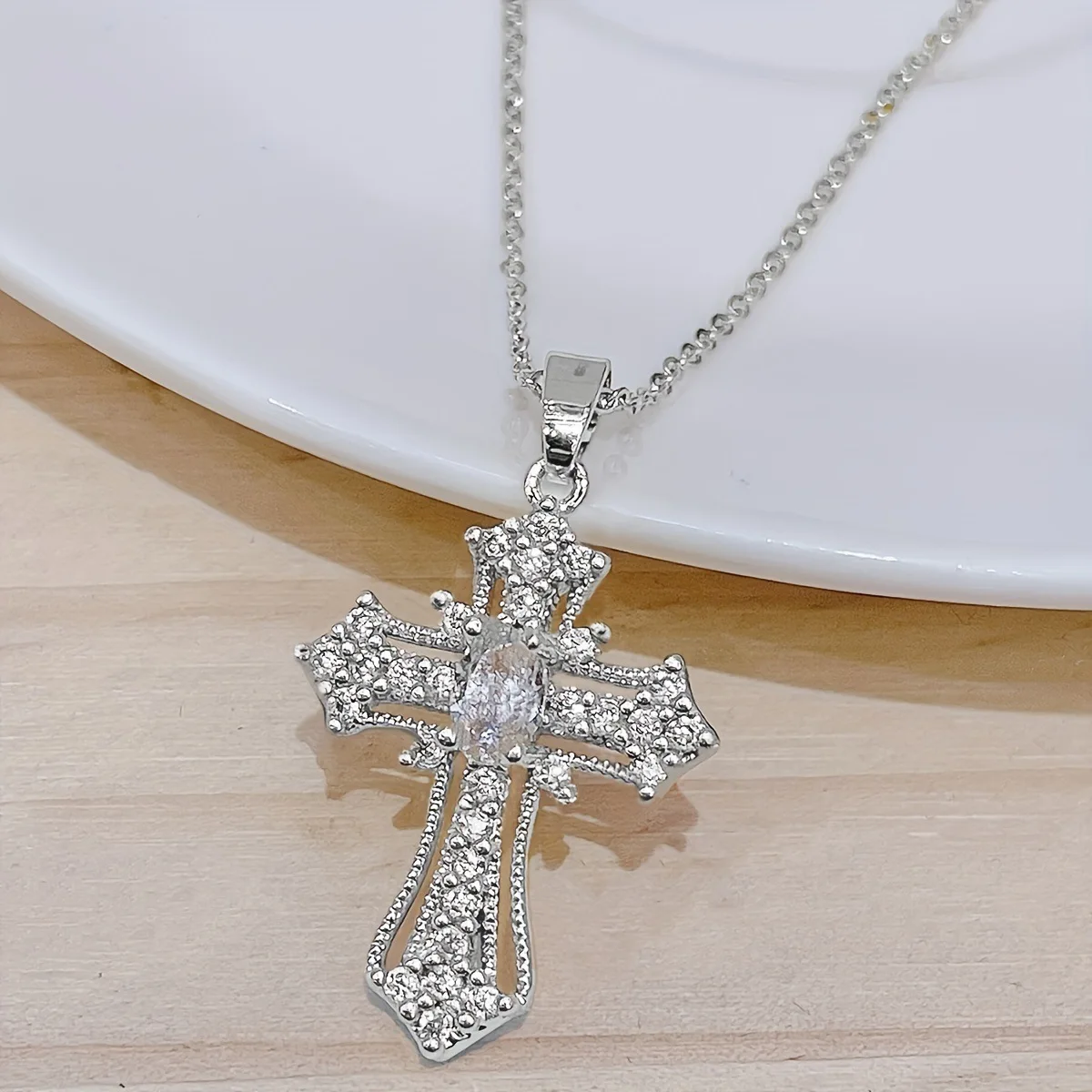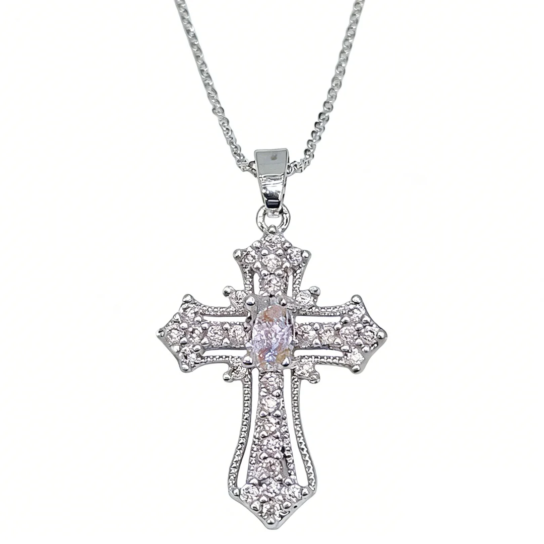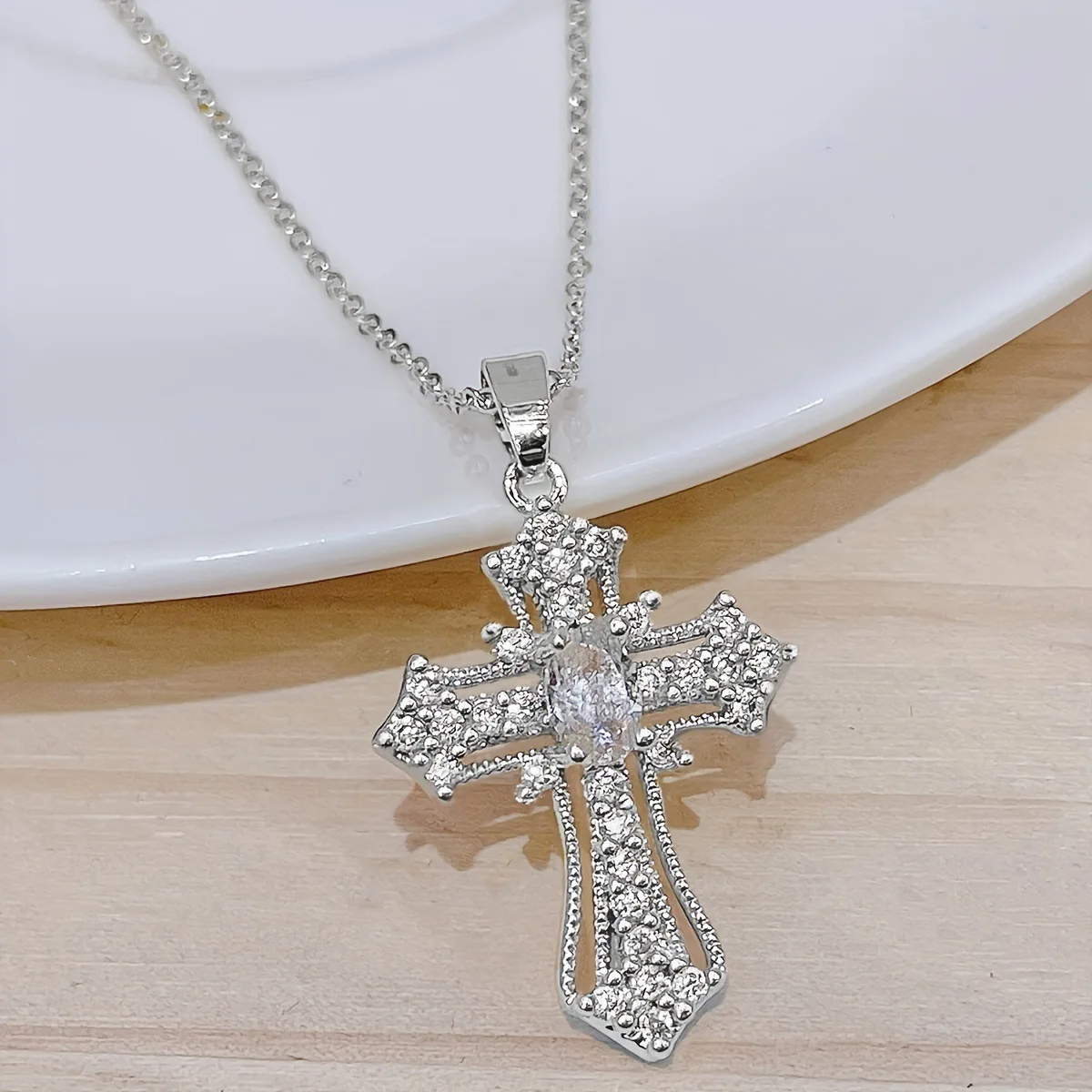 1-piece vintage cross necklace, exquisite and unique pendant clavicle chain, white and silver women’s fashion jewelry, suitable