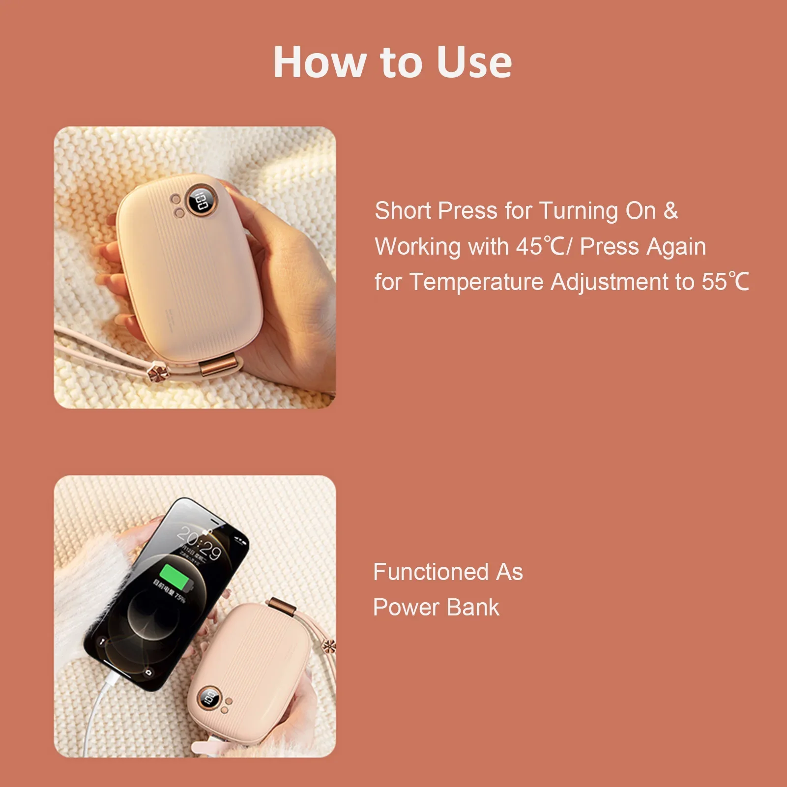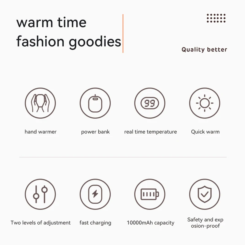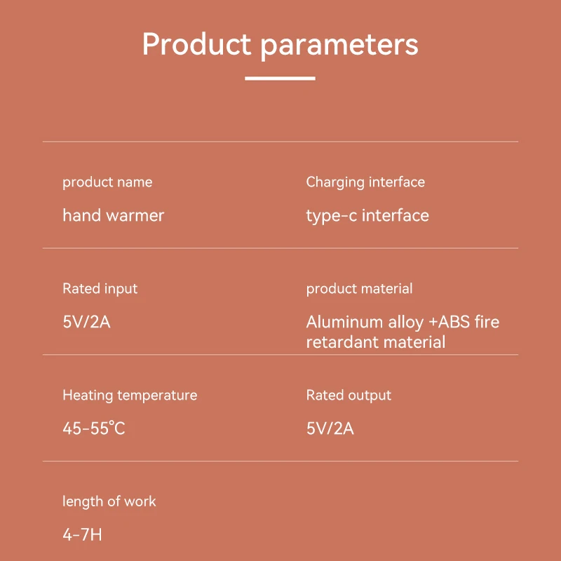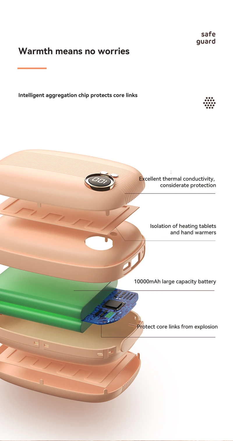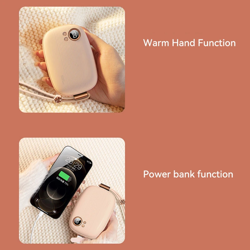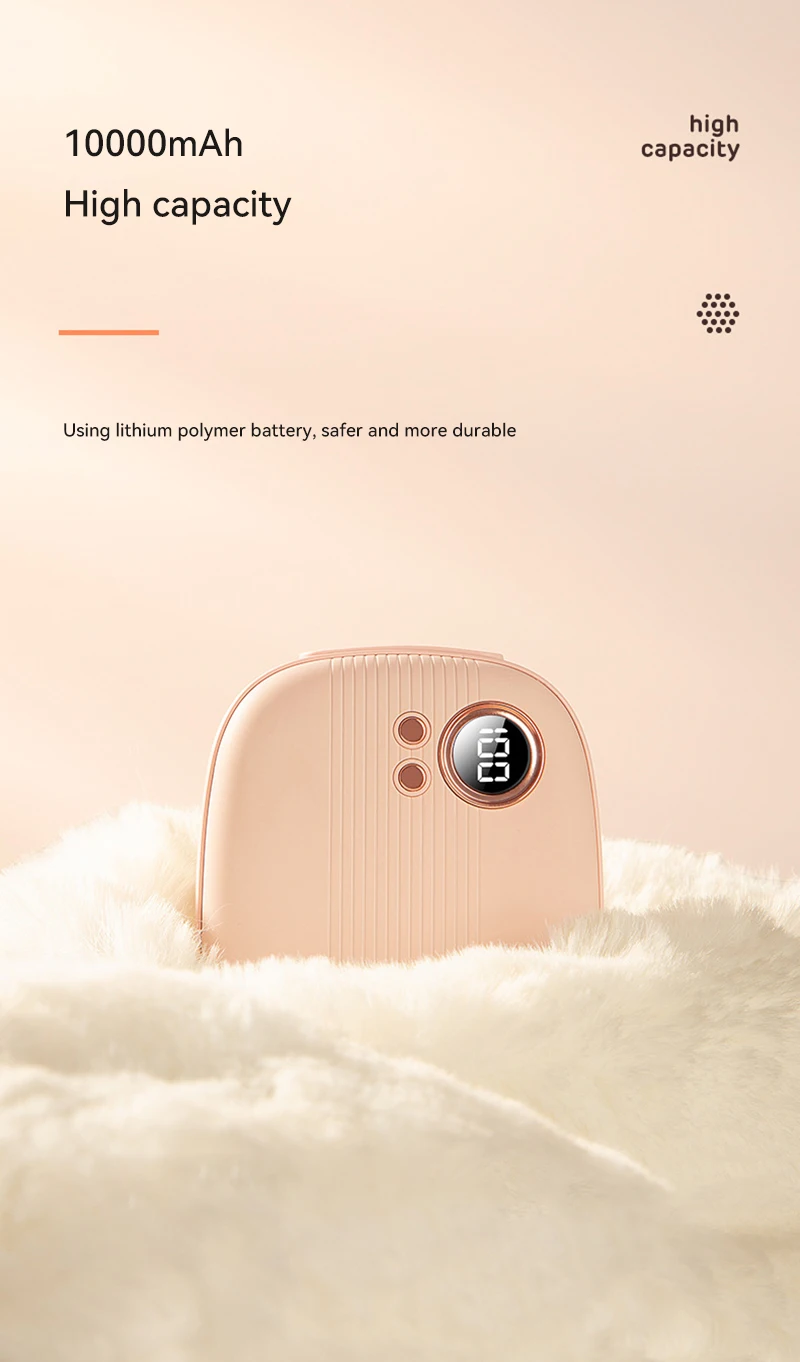2-in-1 function of hand warmer and p-ower bank, large capacity for long working hours.