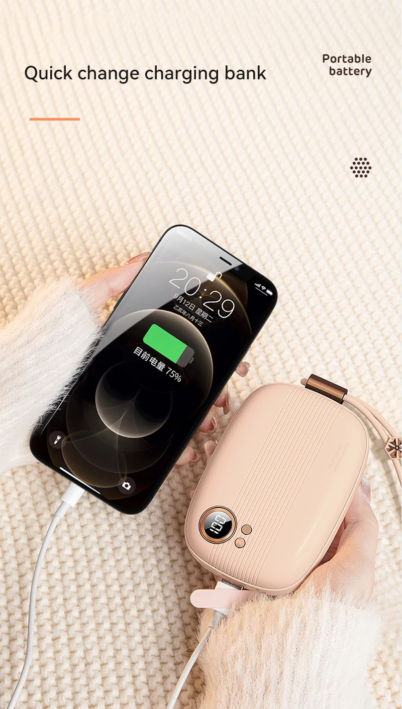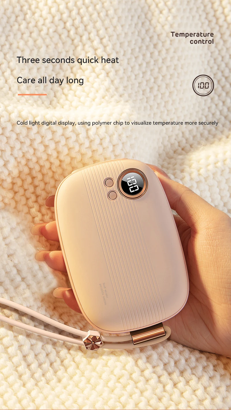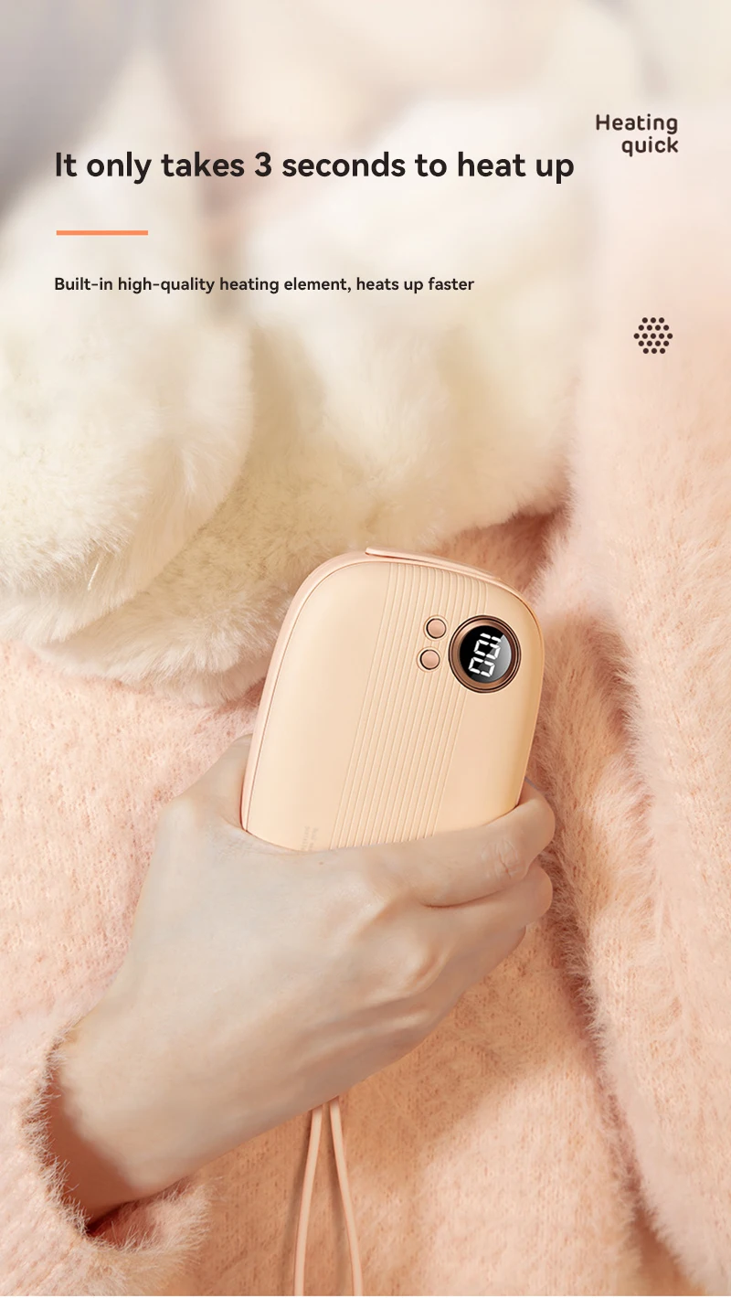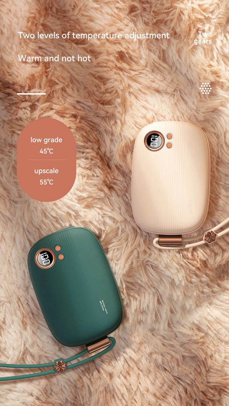 The elegant design electric hand warmer with 5000mAh large capacity can also be used as a useful p-ower bank. Made of superb ABS&aluminum alloy material and designed with better heating elements, it’s safe to use and nice enjoyment.
