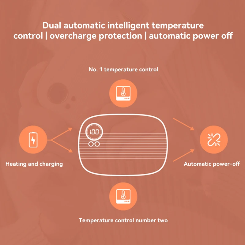 2 adjustable heating modes: low (45℃), high (55℃), designed with overcharge p-rotection and auto shut down function for safe use.