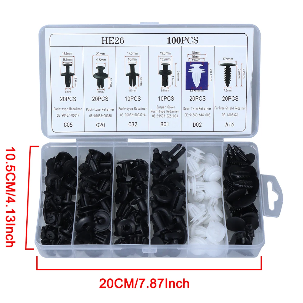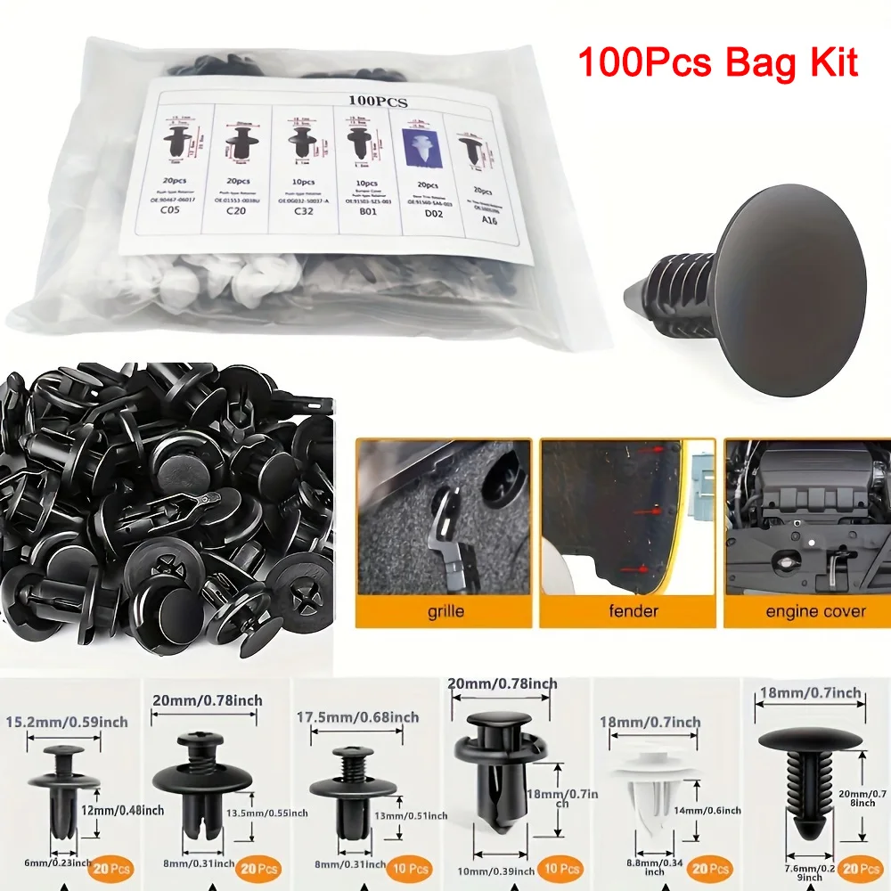 Characteristics: A completely new and top-notch quality. The rivet post pressure expands the legs for quick and permanent fastening. Commonly used for car fenders, bumpers, doors, or other car surfaces. These rivets are manufactured from plastic material.