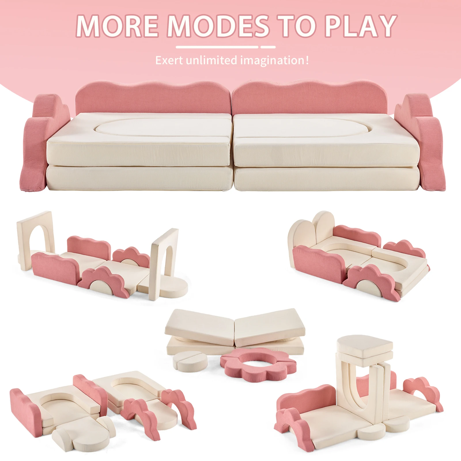12-Piece Modular Kids Sofa All-Sponge Design Free Combination Pink-color & White Colorblock Corduroy Fabric