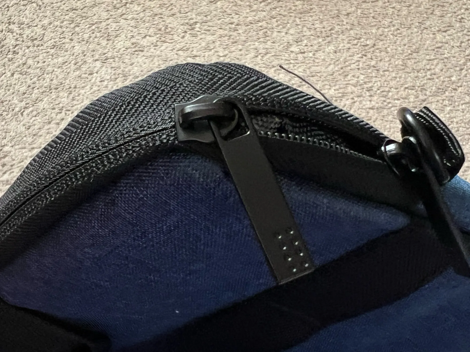 It’s blue and as pictured. s new and a few fuzz outside. There are a few extended threads but not an issue. The zipper is smooth. Nice padding inside. The should strap is a little thin and short, but than is a size preference. Overall, nicer than i thought.