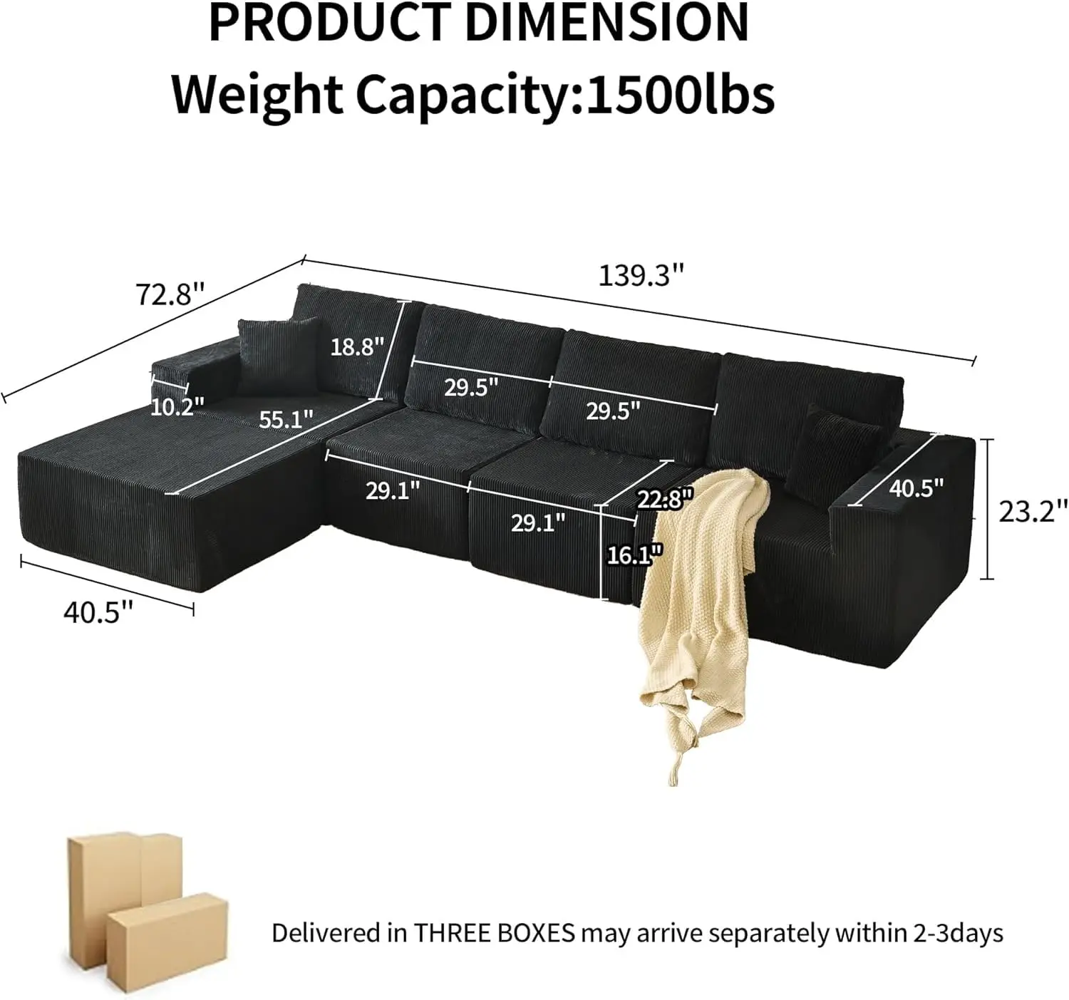 139″ Cloud Sectional Sofa Deep Seat Modular L-Shape Frameless Corduroy Living Room 4-Seater Left Chaise Black Customized