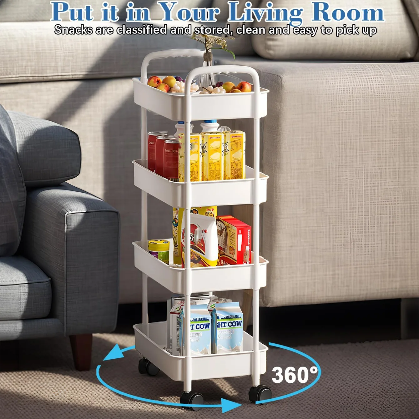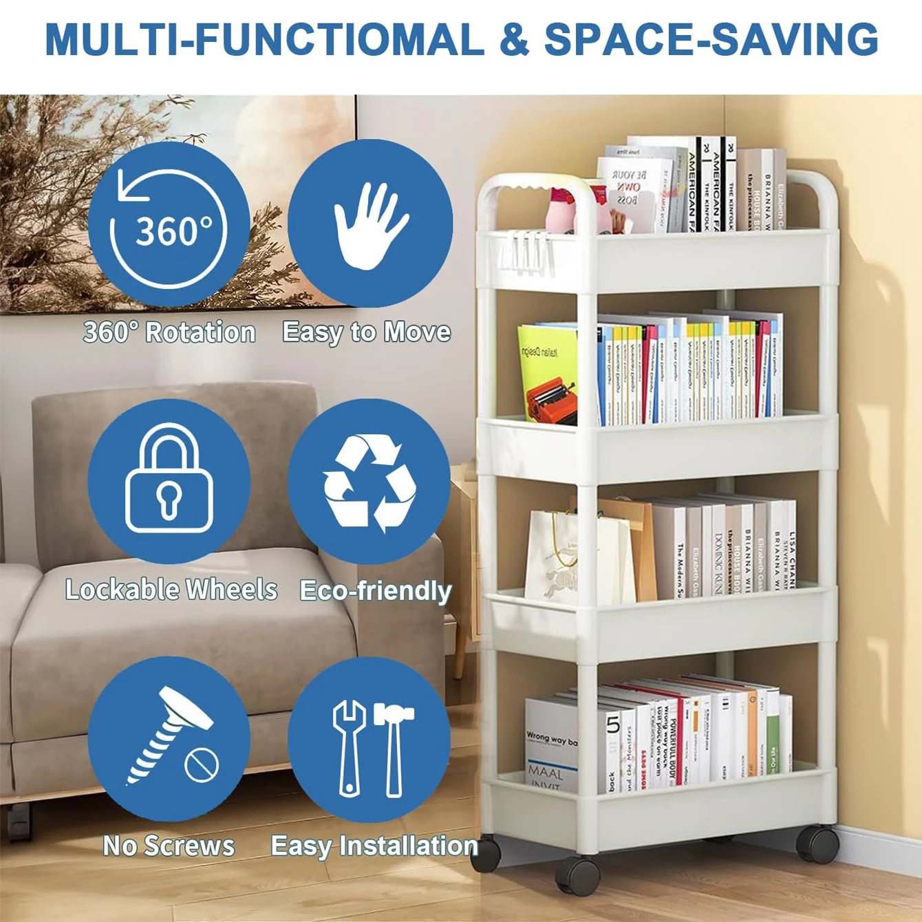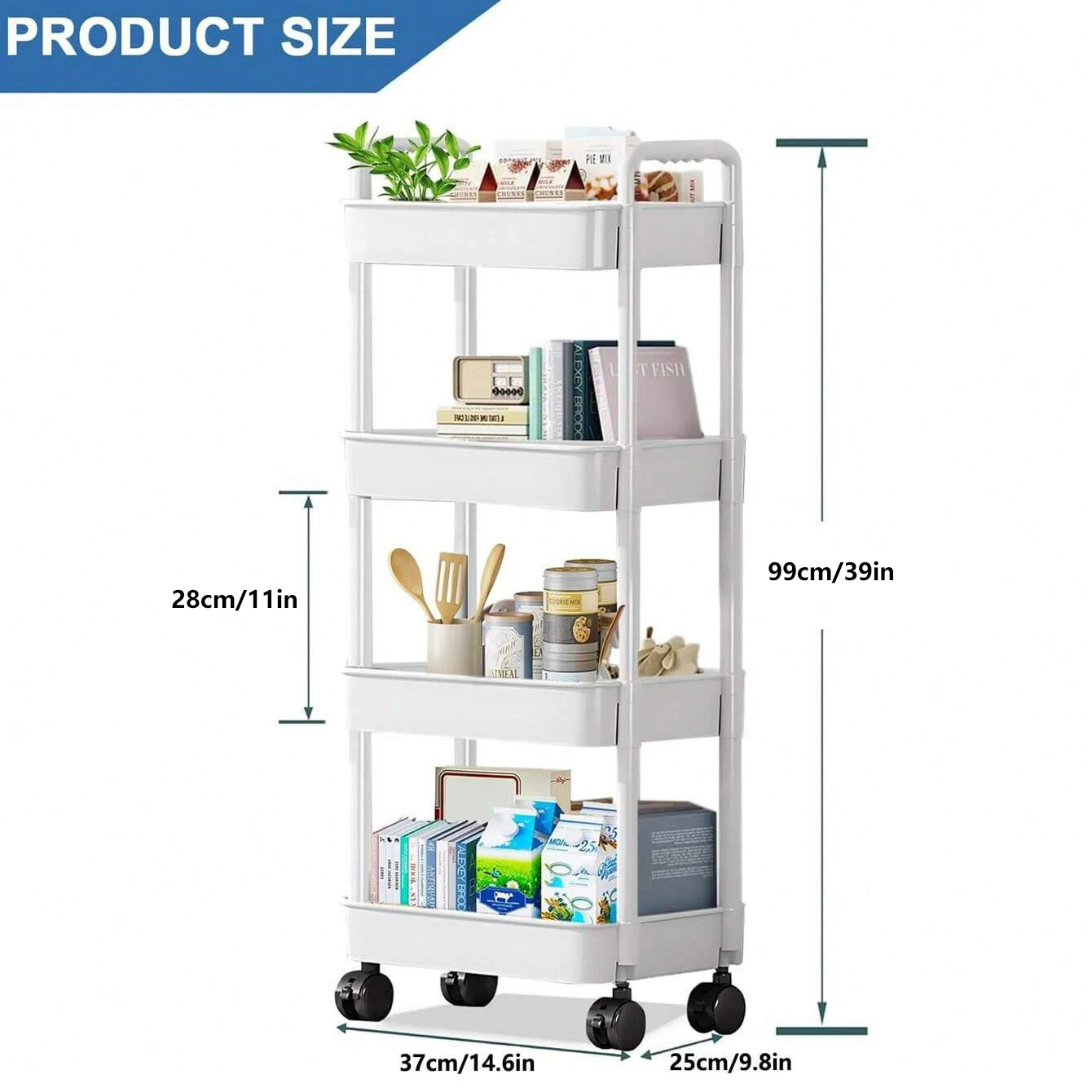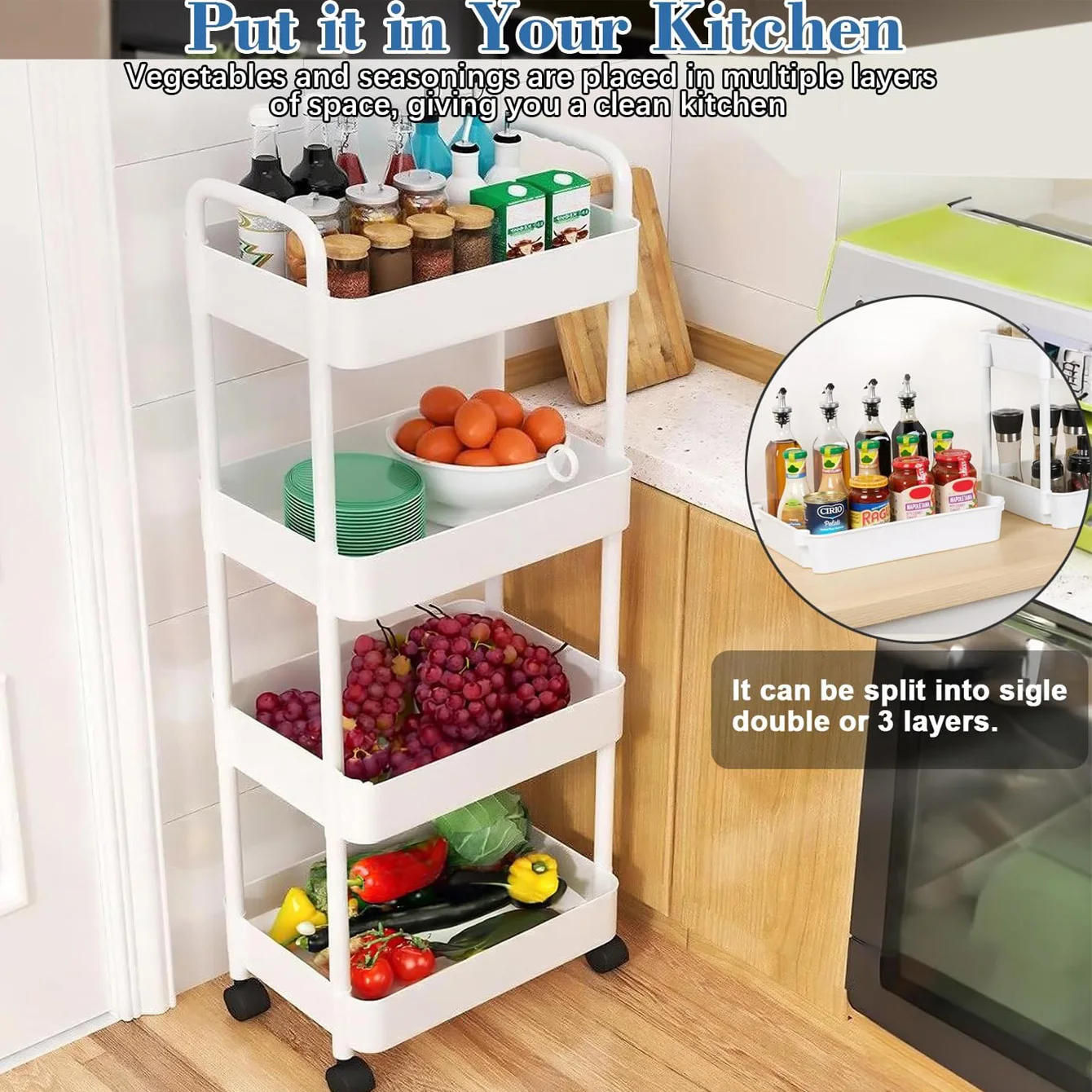 This 4-tier rolling storage cart is perfect for organizing your kitchen, bathroom, or office. Its compact design makes it easy to move around while providing ample storage space.