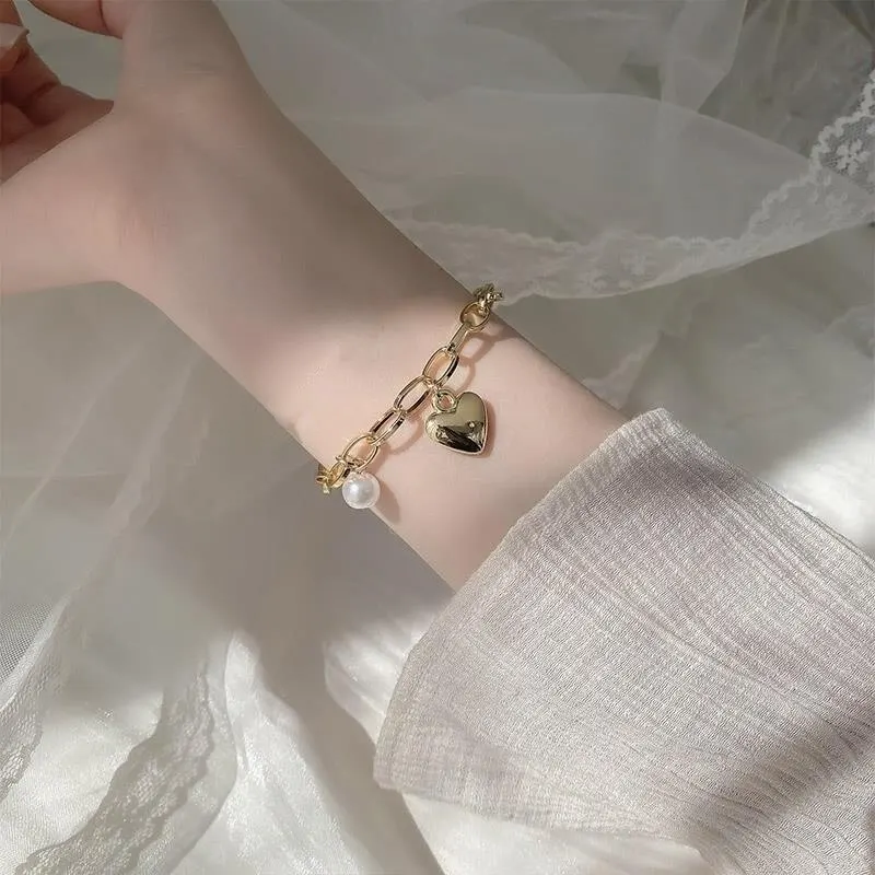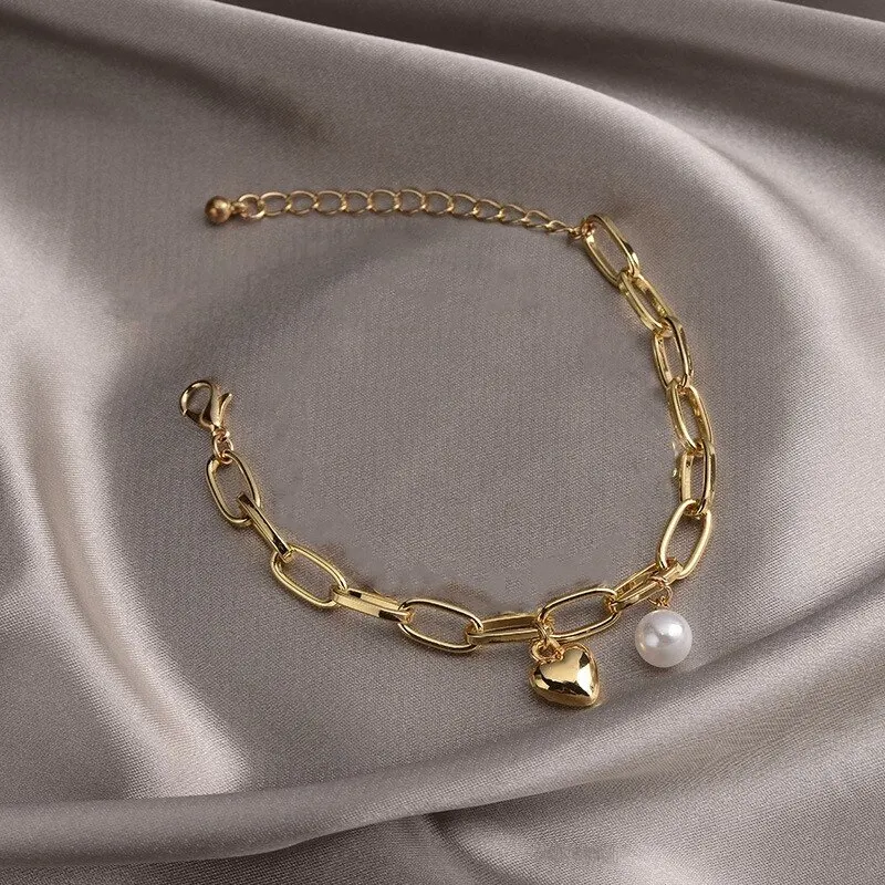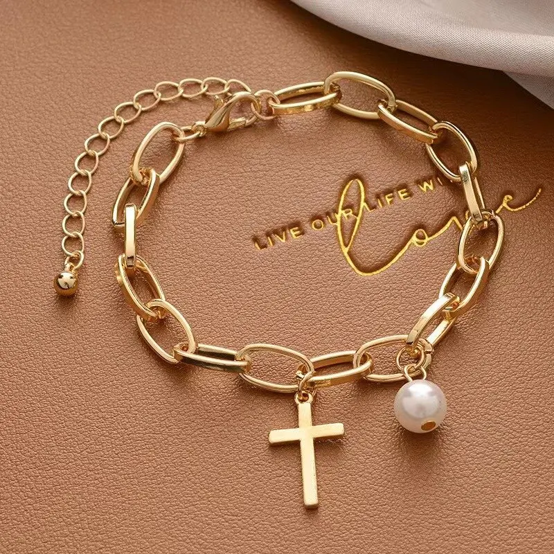 1pcs Gold-color Bracelet Ladies Simple Style Thick Cross Chain With Love Human Head Cross Pearl Pendant