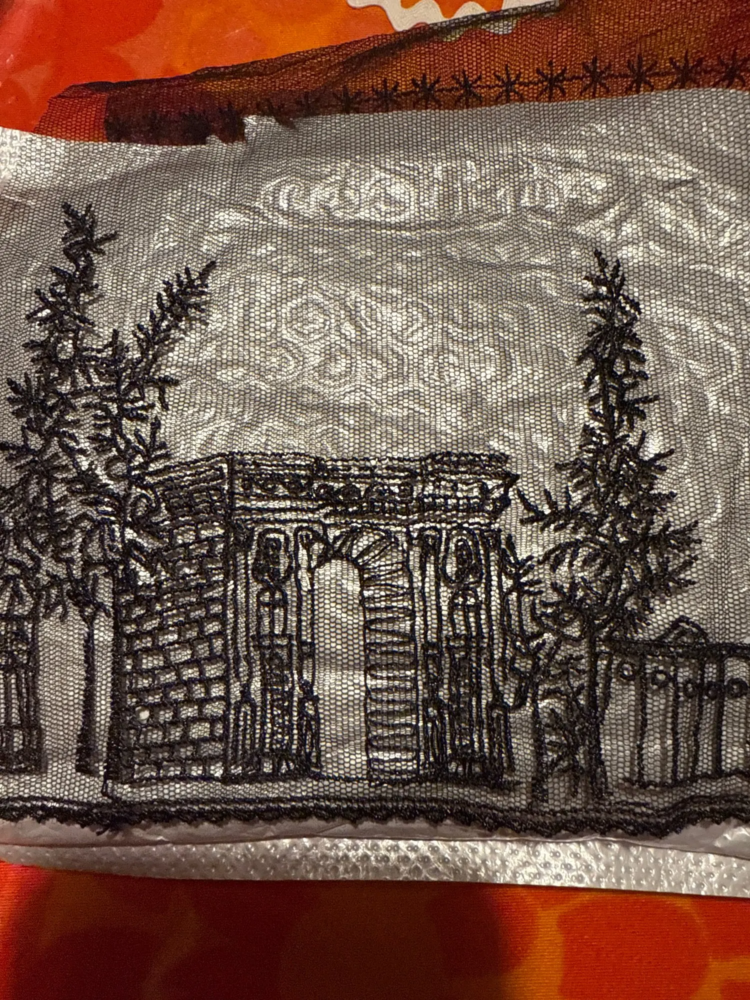 Embossed embroidery. The mesh gives a sparkle when illuminated by electricity, but this is true for all meshes. However, it doesn’t make it look cheap.