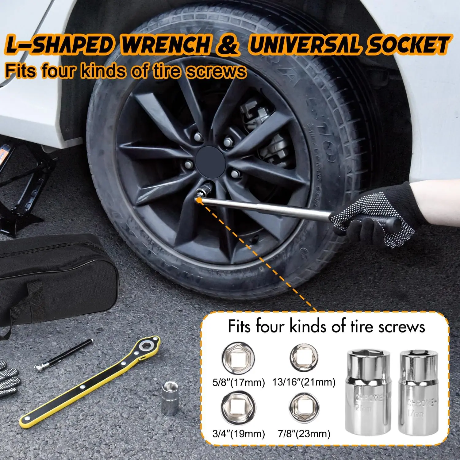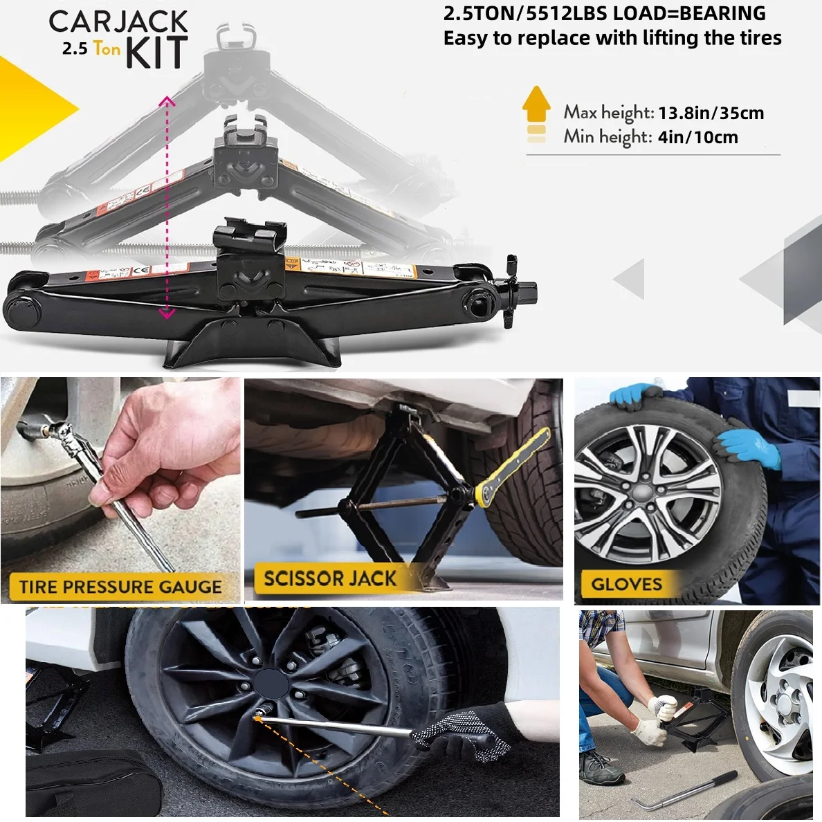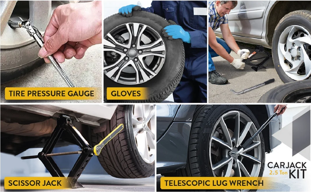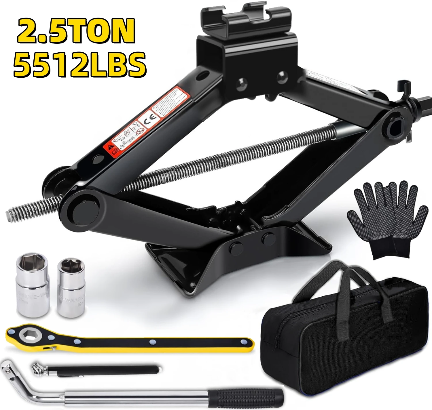【Complete Tire Replacement Kit】1x 2.5T Scissor jack; 1x Ratchet Wrench; 1x Lug Wrench(17/19mm 21/23mm); 1x Gloves; 1x Pencil Tire Pressure Gauge; 1x Storage Bag.he all-inclusive kit fits perfectly in your trunk or garage, ready to tackle any emergency tire replacement job.