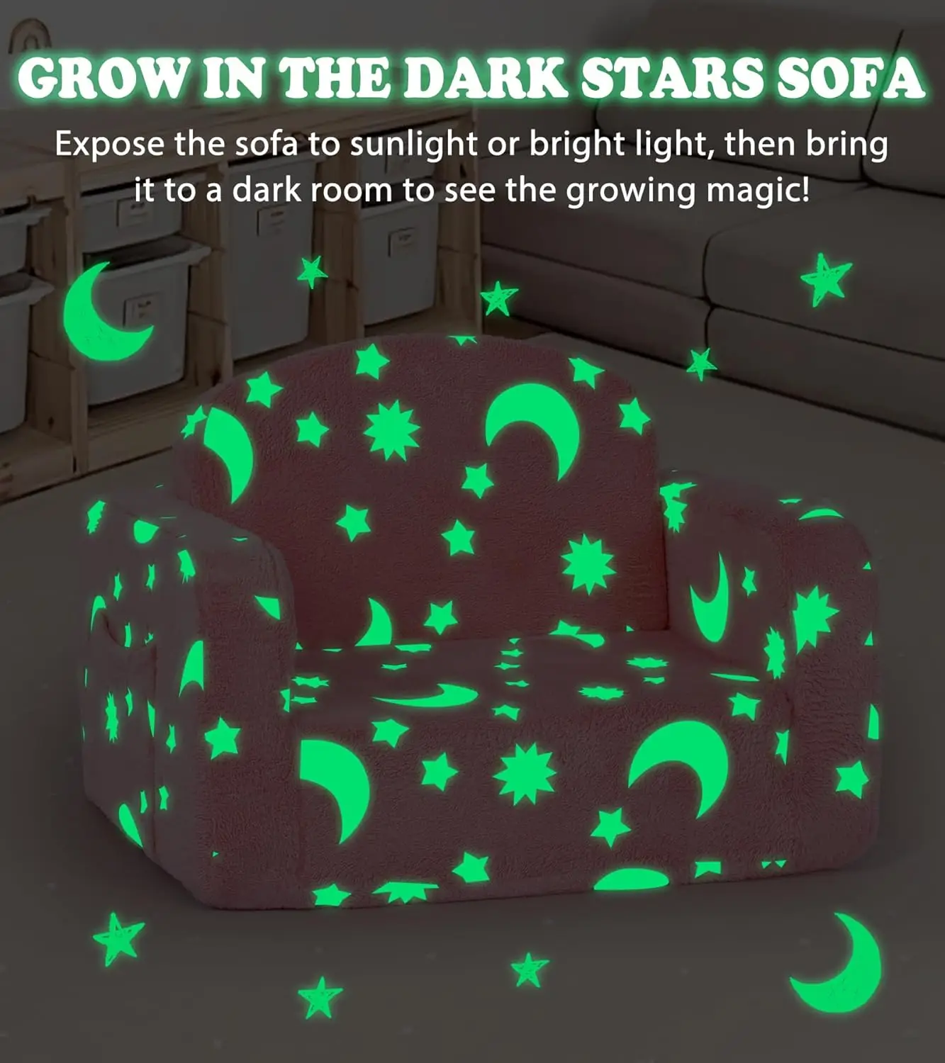 About this item: 1. Complete Comfort Set: This versatile 2-in-1 toddler couch comes with a soft matching blanket and plush cloud pillow for ultimate coziness. Perfect for playrooms, nurseries, or kids’ bedrooms, it provides a stylish and functional seating solution that encourages relaxation and imaginative play. 2. Magical Glow Feature: Spark your child’s wonder with the enchanting glow-in-the-dark star pattern! Simply expose the stars to sunlight or bright light for 3-5 hours to charge them, then enjoy their soft glow during evening activities like reading, watching TV, or family snuggle time. This unique feature creates a magical atmosphere that kids adore. 3. Durable Construction: Built with high-density foam and sturdy support, this kids’ couch offers lasting comfort and reliability. It maintains its shape through daily use while providing a safe and cozy spot for children to sit or lounge, making it an essential addition to any play area. 4. Practical Design Elements: Featuring convenient side pockets for storing books, tablets, toys, and other essentials within easy reach. The lightweight design includes a carry handle for effortless portability around the home or during travel. Ideal for living rooms, playrooms, or on-the-go seating needs. 5. Easy Maintenance: The soft, skin-friendly cover is removable and machine washable for simple cleaning. Parents appreciate the hassle-free care while children enjoy fresh comfort with each use. Note: This couch arrives vacuum-packed; after unwrapping allow 24-48 hours for full expansion into its plush sofa form. 6. Versatile Usage: Suitable as both comfortable seating and a cozy nap spot during daytime activities or nighttime routines. The fold-out design allows easy storage when not in use while maintaining quick setup capability whenever needed. 7. Safety Considerations: Designed specifically for young children with attention to material safety and structural stability ensuring peace of mind during use.
