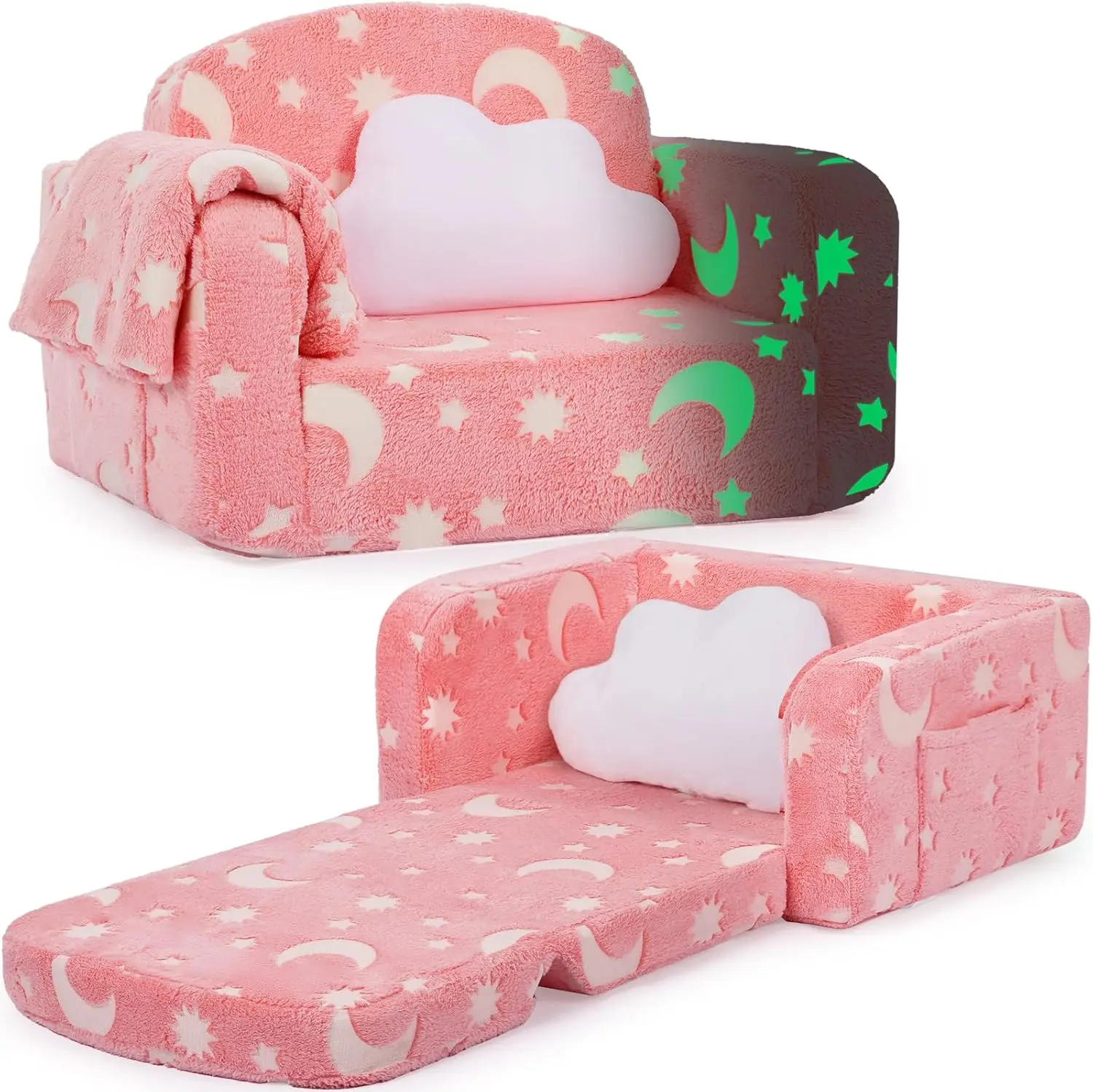About this item: 1. Complete Comfort Set: This versatile 2-in-1 toddler couch comes with a soft matching blanket and plush cloud pillow for ultimate coziness. Perfect for playrooms, nurseries, or kids’ bedrooms, it provides a stylish and functional seating solution that encourages relaxation and imaginative play. 2. Magical Glow Feature: Spark your child’s wonder with the enchanting glow-in-the-dark star pattern! Simply expose the stars to sunlight or bright light for 3-5 hours to charge them, then enjoy their soft glow during evening activities like reading, watching TV, or family snuggle time. This unique feature creates a magical atmosphere that kids adore. 3. Durable Construction: Built with high-density foam and sturdy support, this kids’ couch offers lasting comfort and reliability. It maintains its shape through daily use while providing a safe and cozy spot for children to sit or lounge, making it an essential addition to any play area. 4. Practical Design Elements: Featuring convenient side pockets for storing books, tablets, toys, and other essentials within easy reach. The lightweight design includes a carry handle for effortless portability around the home or during travel. Ideal for living rooms, playrooms, or on-the-go seating needs. 5. Easy Maintenance: The soft, skin-friendly cover is removable and machine washable for simple cleaning. Parents appreciate the hassle-free care while children enjoy fresh comfort with each use. Note: This couch arrives vacuum-packed; after unwrapping allow 24-48 hours for full expansion into its plush sofa form. 6. Versatile Usage: Suitable as both comfortable seating and a cozy nap spot during daytime activities or nighttime routines. The fold-out design allows easy storage when not in use while maintaining quick setup capability whenever needed. 7. Safety Considerations: Designed specifically for young children with attention to material safety and structural stability ensuring peace of mind during use.