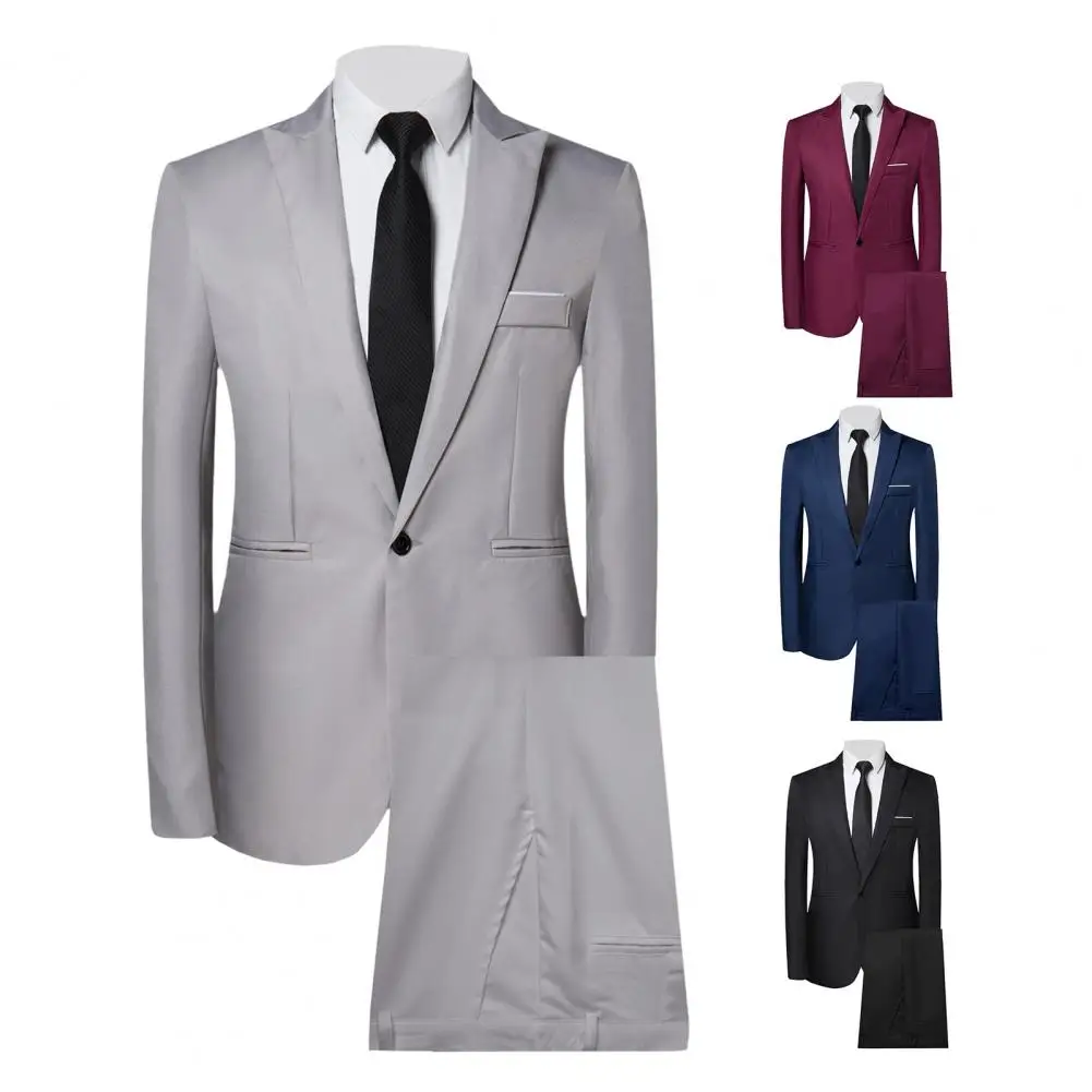 2Pcs/Set Men Business Outfit Lapel Long Sleeve Single Breasted Suit Coat Solid Color Suit Pants Set Slim Fit Workwear