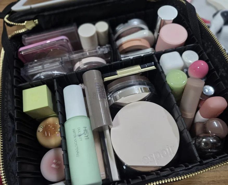 The storage space is excellent. The large pouch I was using before was about to burst, but when I put my cosmetics in this one, they become much more compact. The mirror also has a light. I’m a bit worried it might break, but it seems quite sturdy.