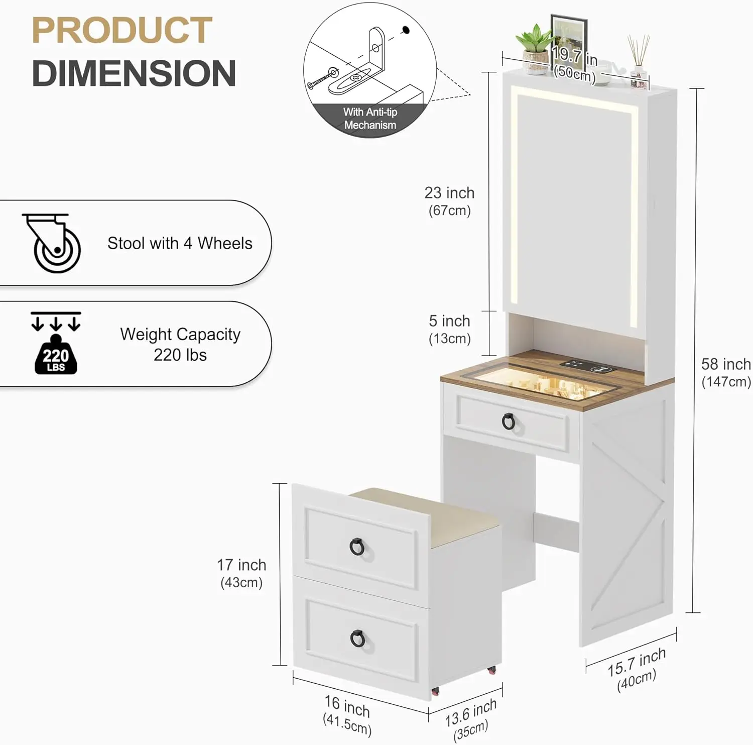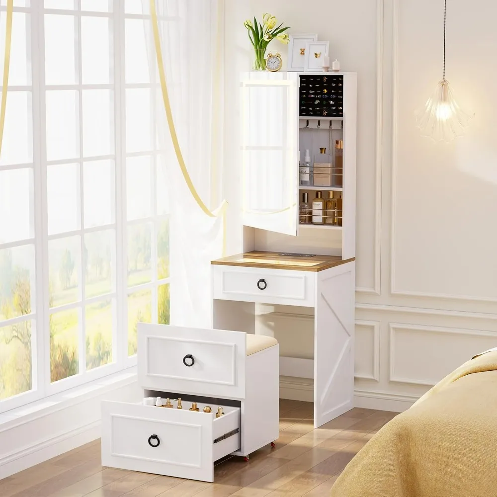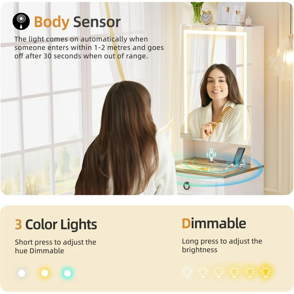 This product features a spacious and concealed jewelry organizer, accompanied by three drawers—one of which boasts a glass top—two shelves, and a cushioned chair with a sizable flip-top compartment, all designed to accommodate a multitude of cosmetics, jewelry, and skincare items. The vanity table is a versatile 3-in-1 unit, integrating a jewelry armoire and a rolling bench into a compact corner vanity. It offers ample storage for jewelry with 108 slots for rings and earrings, as well as 30 hooks for necklaces and bracelets. The chair is equipped with wheels, allowing for easy maneuverability even when fully loaded. The vanity table is equipped with human sensor LED lights that provide three adjustable light colors—blue-white, warm white—to suit various makeup routines. The lights automatically activate when someone is nearby and switch off when the area is vacated. Additionally, the table includes a convenient charging station with a wireless charger, one USB port, and one TYPE-C port, ensuring your phone stays charged while you’re busy with makeup or other tasks. Our customer-centric service includes comprehensive manuals, toolkits, and safety equipment such as wall anchors and brackets to secure the table against falls, especially if children or pets are prone to climbing. Should you encounter any missing or damaged parts or have any other inquiries, our support team is readily available to assist you.