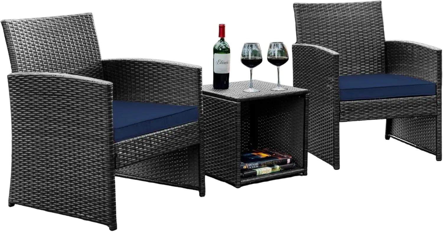 3-Piece Wicker Patio Furniture Set with Table and 2 Chairs, Waterproof Outdoor Seating in Grey/Navy