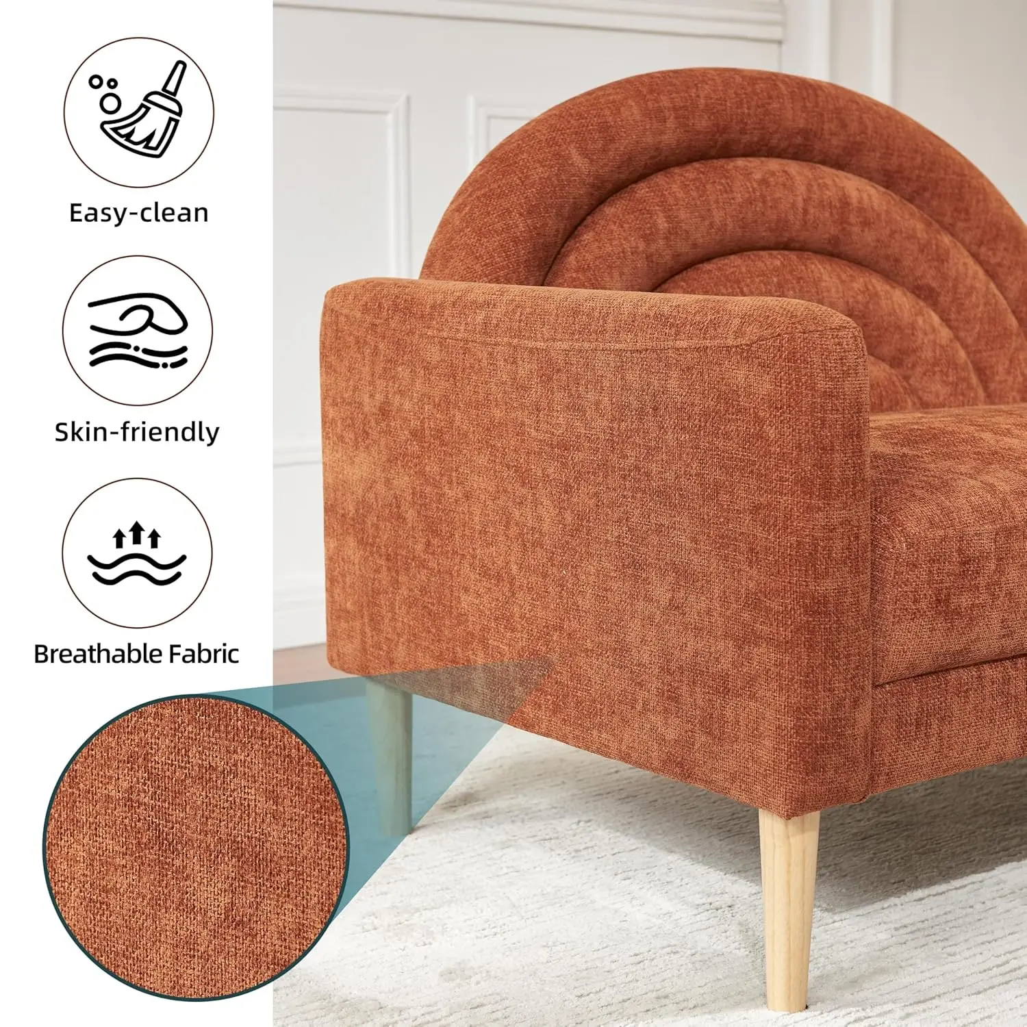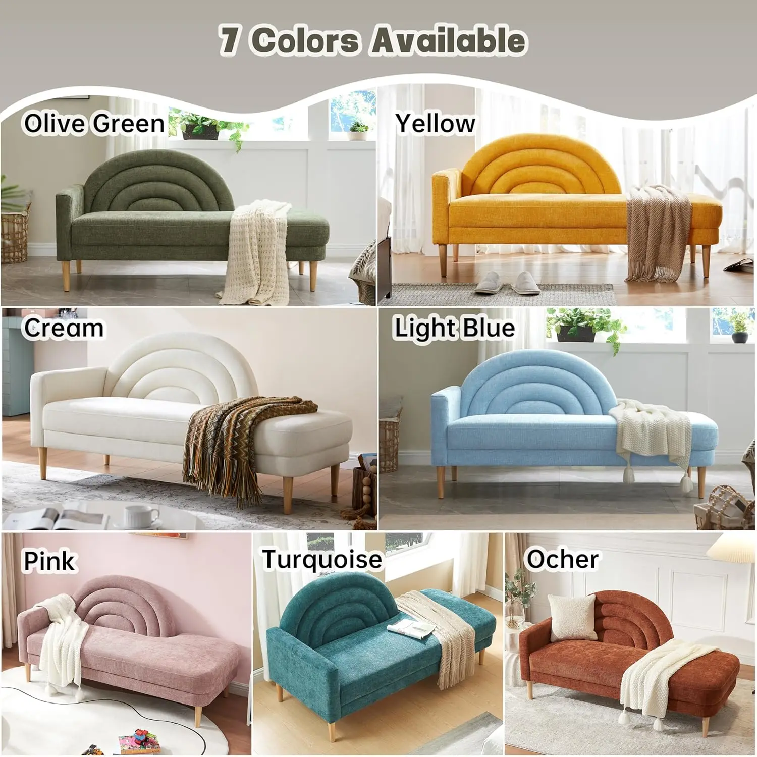 Rainbow Backrest: Our fainting couch features a unique rainbow backrest and a 0.27″ wide right armrest, providing a stylish and comfortable spot to rest your hands. The armrest design makes the chair look unique and stylish, creating a cozy atmosphere when combined with other furniture