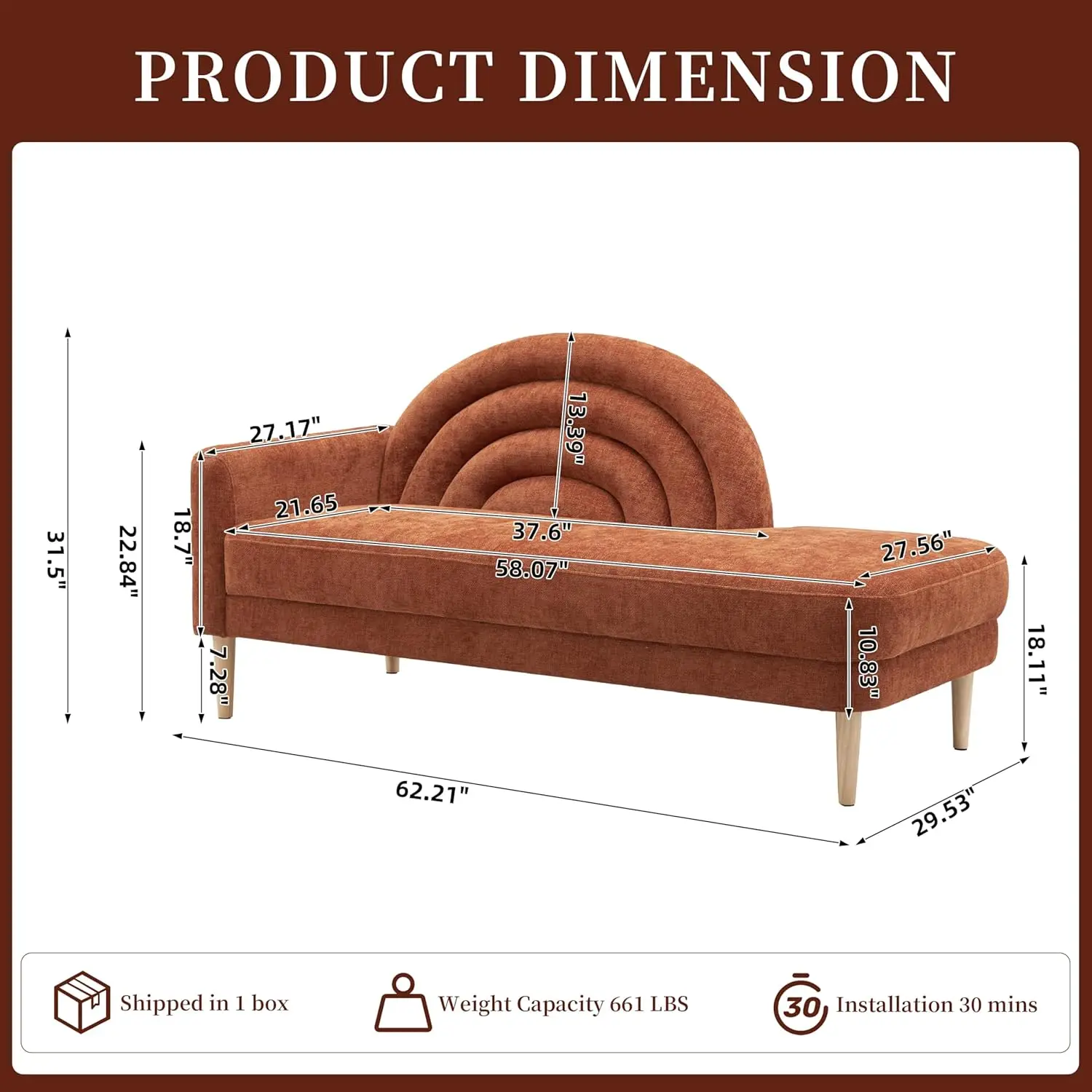 Compact Size with Storage: With dimensions of 62.21″L x 29.53″W x 31.5″H, our small chaise lounge for small space offers 7.28″ ample under-seat storage and cleaning space, making it perfect for compact living areas. The storage space allows you making full use of the space