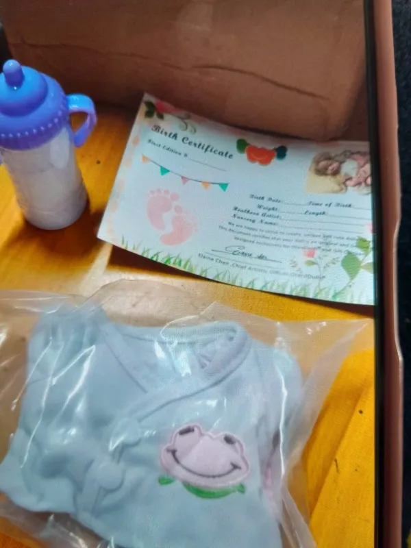 You will receive a dressed doll as same as SKU pictures showing , a feeding bottle +certificate.WITH BOX PACKING!!!