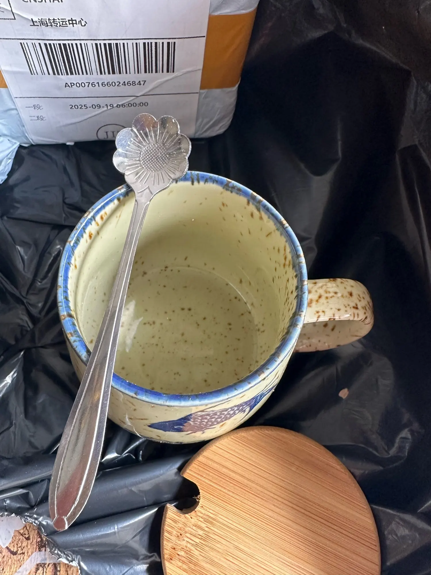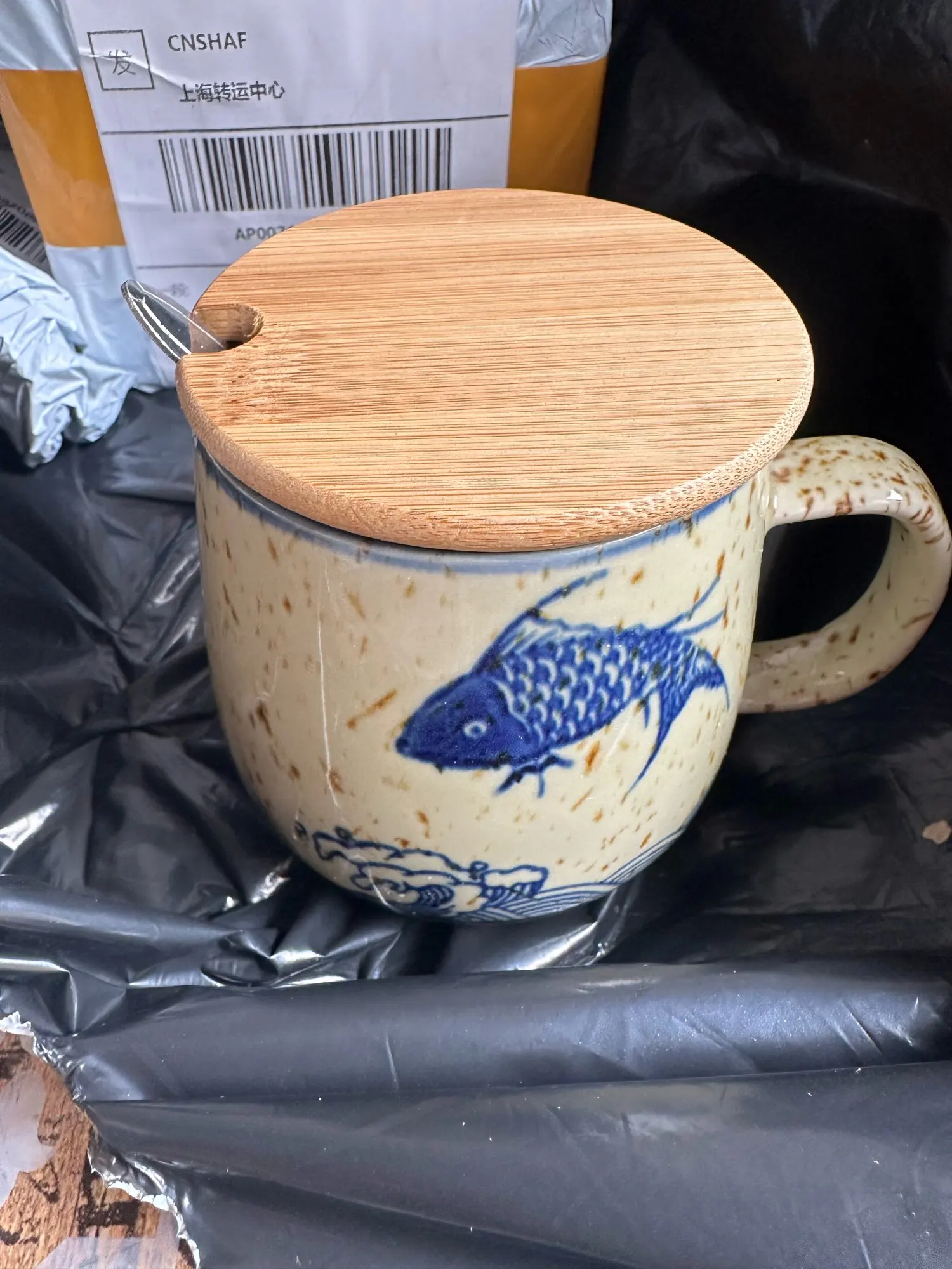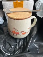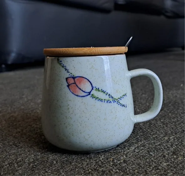 This mug is beautiful!!! with its wooden lid and a flower-printed spoon. I am very impressed by the high quality and delicacy in the workmanship.