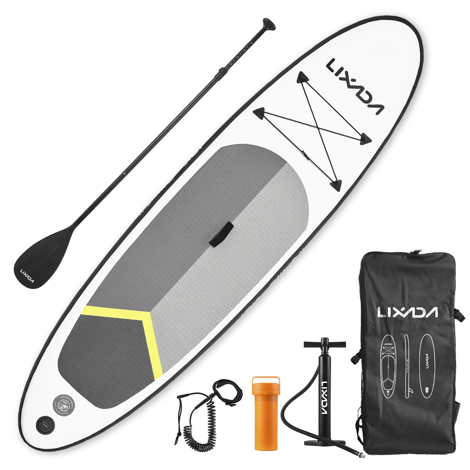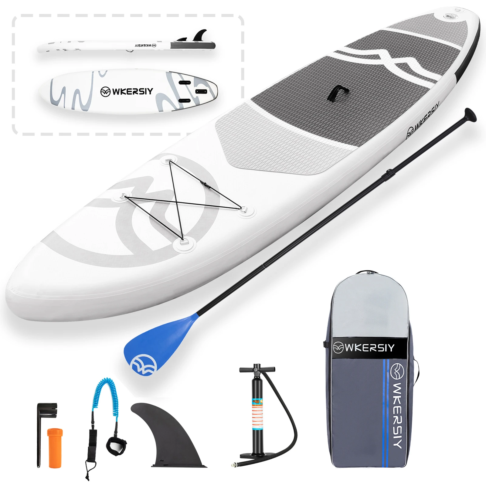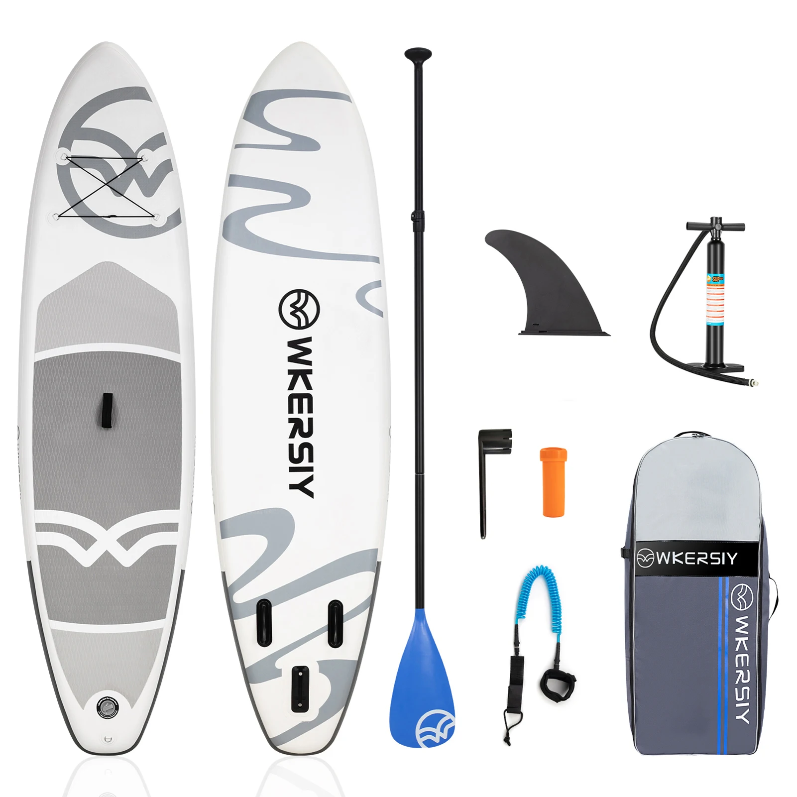Comes with must-have accessories, including an adjustable paddle, surf fin, coiled safety leash, inflating pump, repair kit, storage strap, travel backpack.