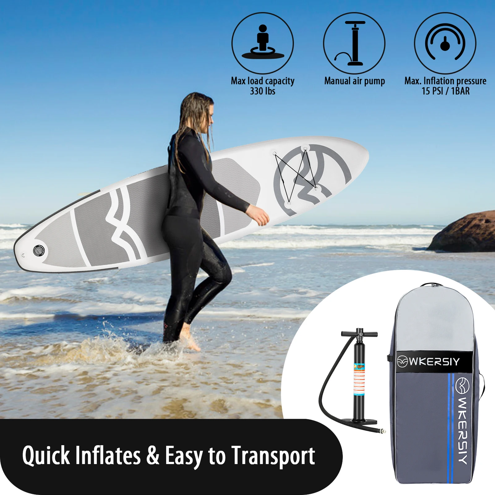 The extra wide SUP design is easy for beginners to stand up and keep balance. Made of the high grade material which is stiff, rigid and sturdy blow up. Soft anti-slip EVA deck pad greatly improved stability and safety while standing. Quickly inflates and deflates for portability. Great for adults, teens, youth with pets of all skill levels.