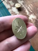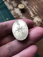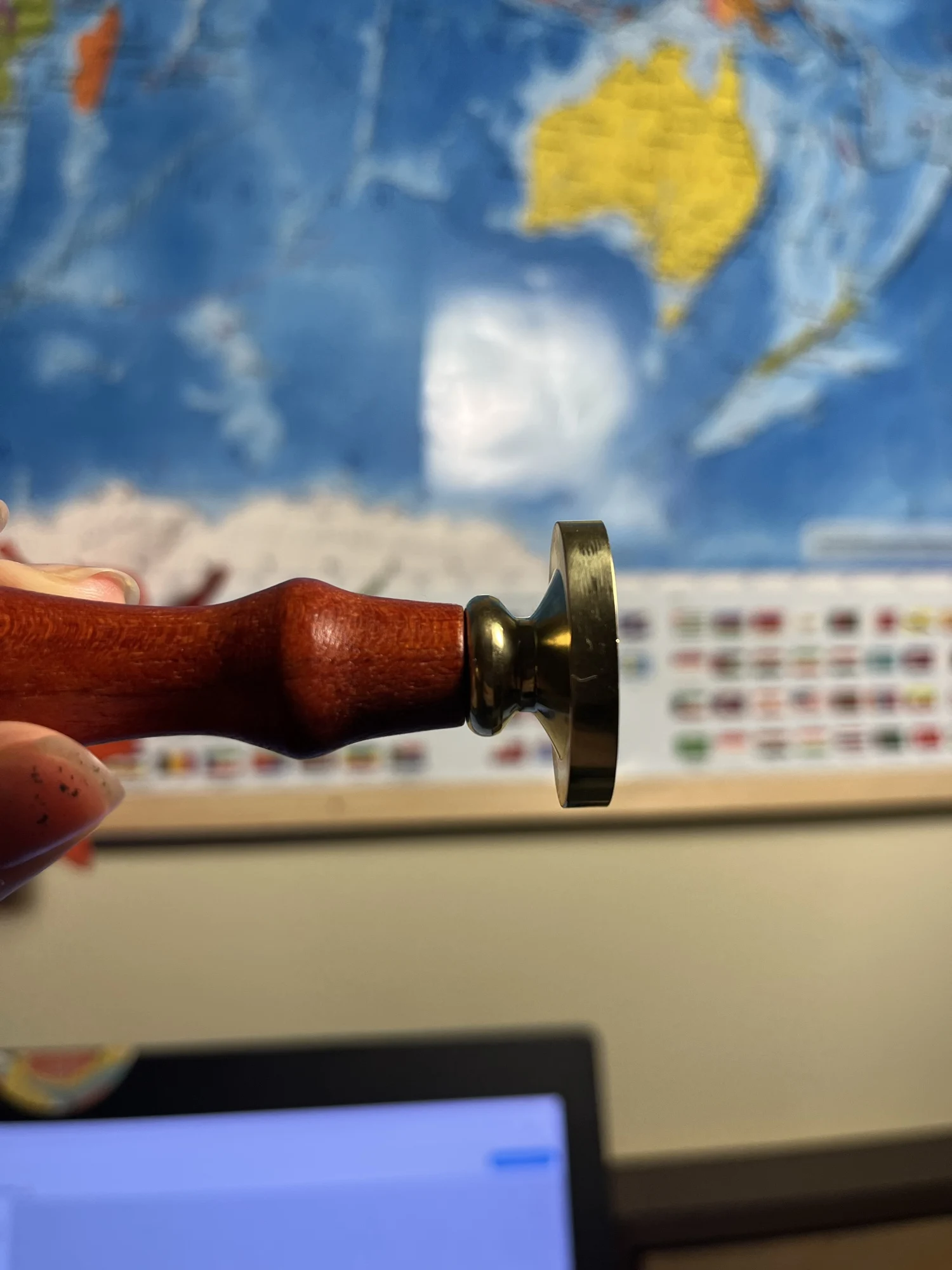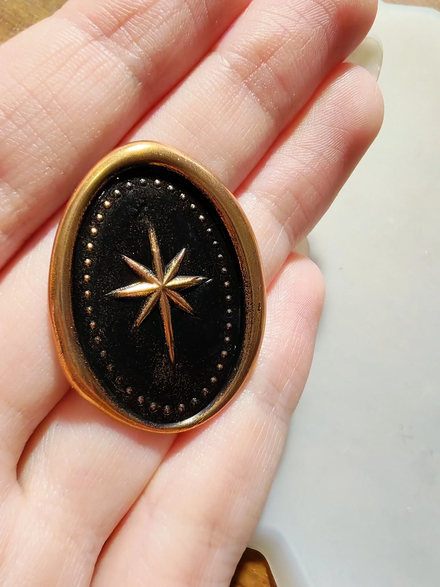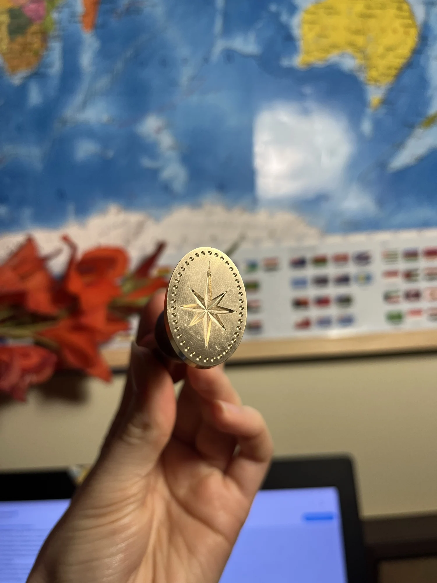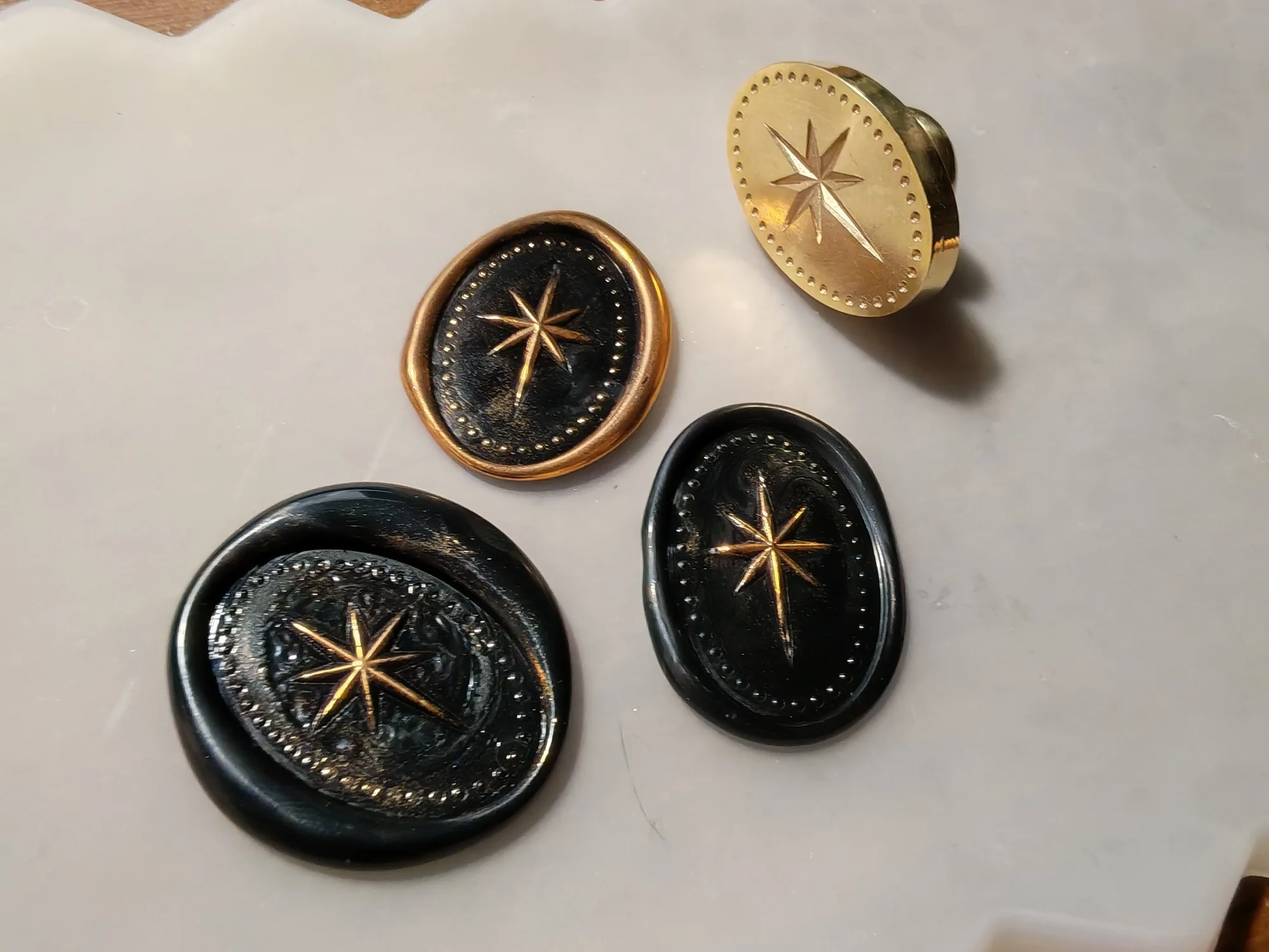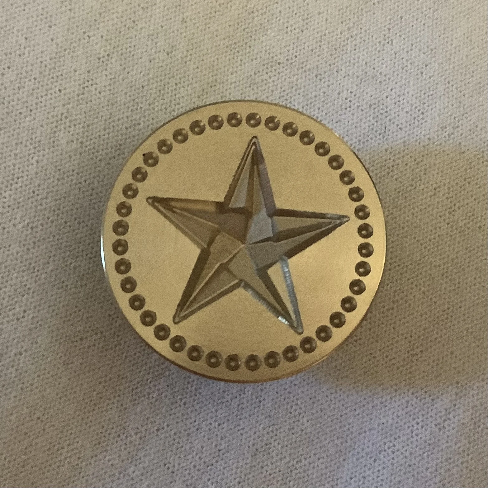 Sharply engraved 25mm solid brass stamp. The star is engraved to 3-4mm depth, creating a highly proud impression. Excellent opportunity to embed different colored wax into your seal. I’ve been hoping to add this one to my life for a long time now, so am happy to be holding it.